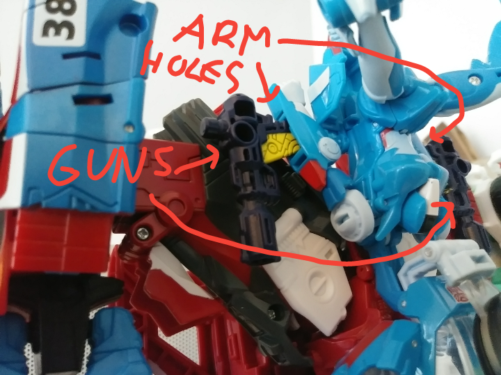 You can attach Generations Chromia to the back of Elita-1 using Fall off Cybertron Blast Off's pistols, or any other items that can simultaneously stick into the 5mm peg holes on Elita-1, and the arm cavities on Chromia. She is pretty sturdy there too.