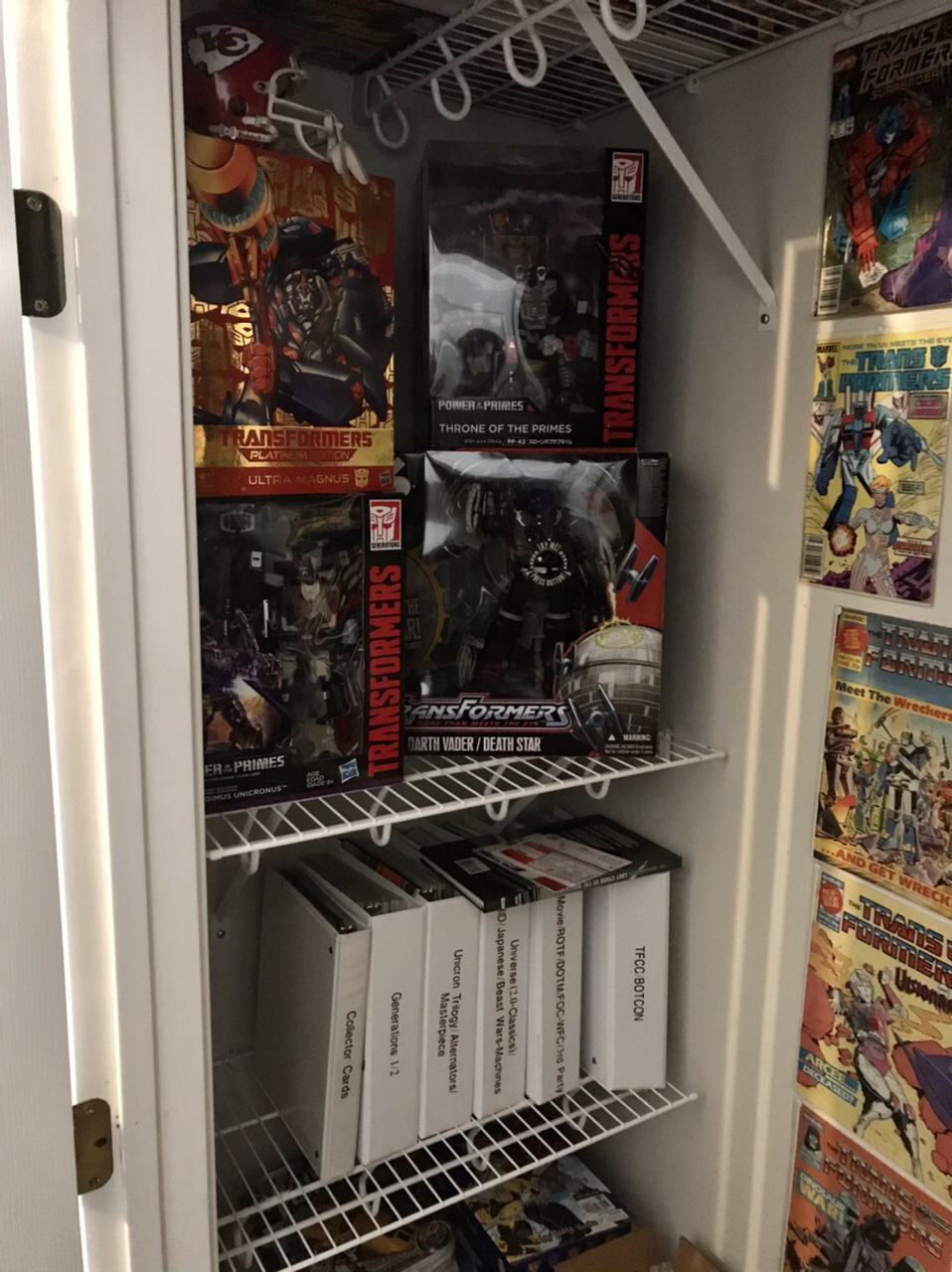 Been working on the closet in my Transformers room. It is almost set. Of course until my 5th case arrives, my Titans are hanging out in there. I added the floating shelf today. Have assorted comics (UK/US) on the wall. As your looking at the closet on the right side i have my parts storage for weapons and such. Left side, I have got one shelf to display some. The lower shelf has my binders with collecting cards and instructions for selected lines. Overall, not bad especially if i leave the doors open.