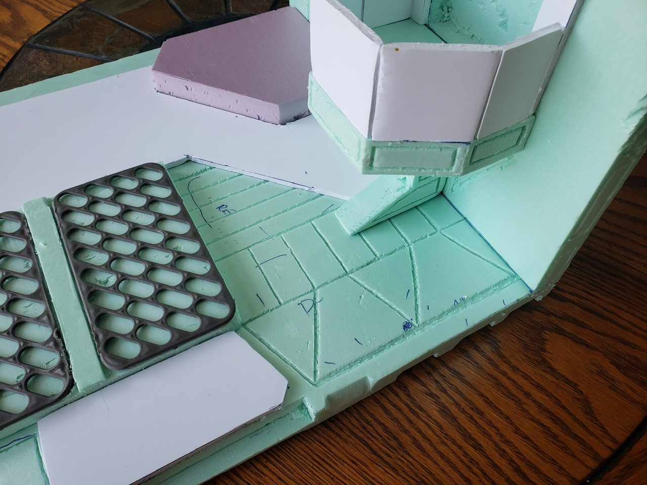 For the Autobot side of the diorama, i added more panel lines to the right side floor area. Then for the back wall, i added more lines and what is suppose to be a door. Once i can get this all painted and highlights added, the detail stuff will become more noticeable. With this side, i still need to add some more lines to the left rear floor area and tweak the back lower left wall area. Its coming along, wont be long before i am sealing it all and applying paint.