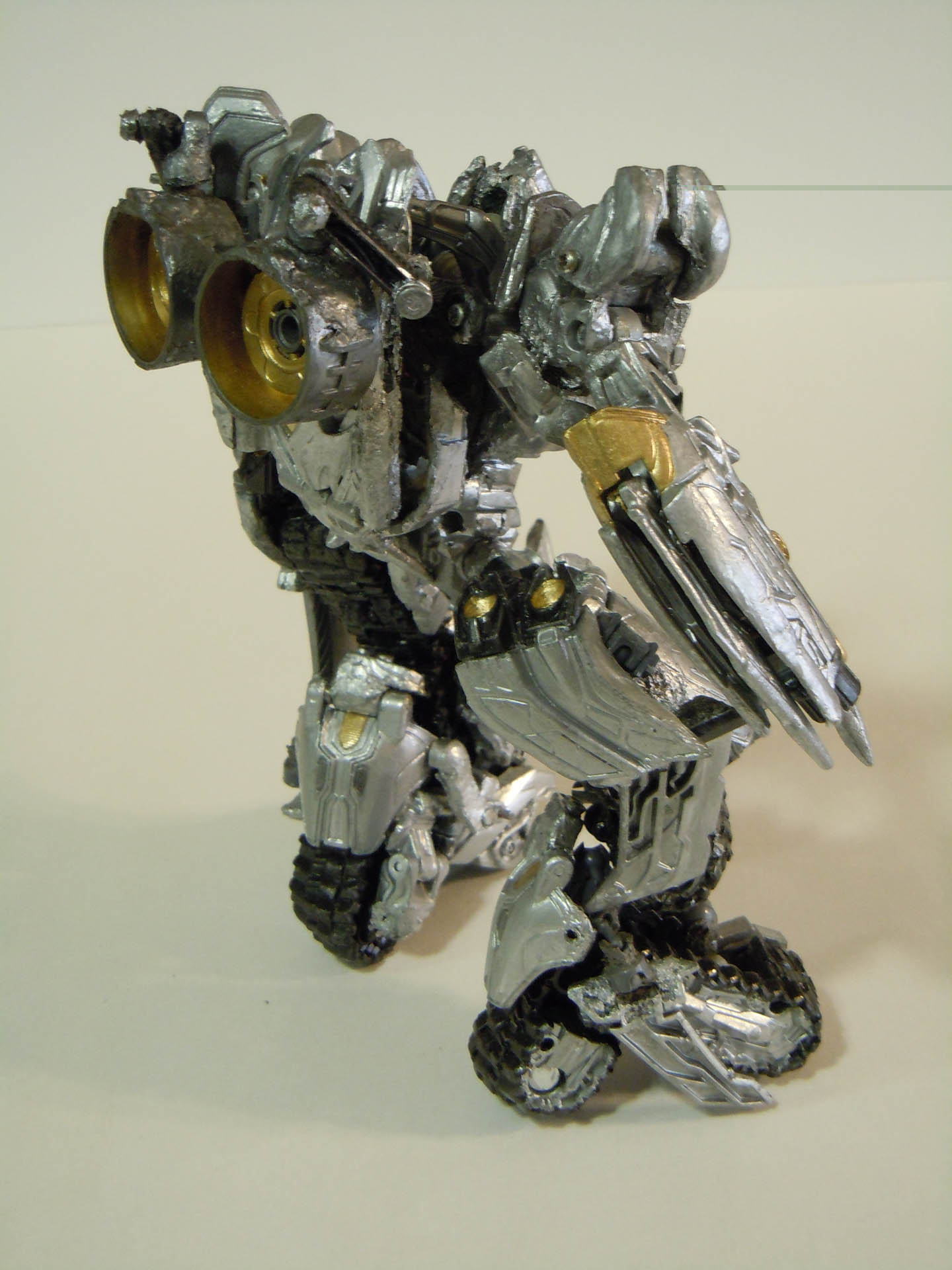 As described, this figure was glued, melted, and screwed together mainly using two Rotf Voyager Megatron figures, with only a few spare pieces from other toys (such as Legends Jetfire legs and Lego turbines). This figure was engineered to be fully transformable; no parts forming involved!