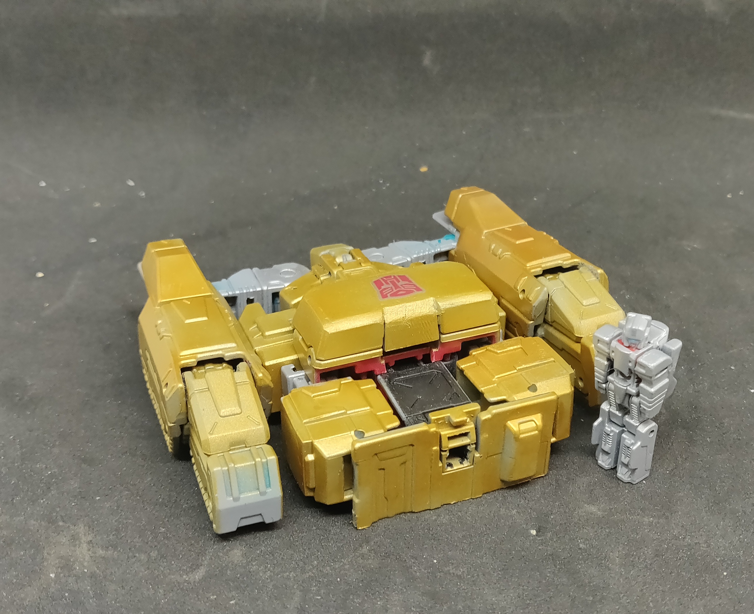 So thought I'd make the founder of my favourite autobot team good old Entire Xaaron but why not make him a Titan master. The based figure is that of TR Perceptor modified some the dials on his arms removed and his chest being filled in, the Head is that of the Titan master Ptero set just painted to match, I've gone for a darker gold look to make him sorta fit in my display a bit better.
