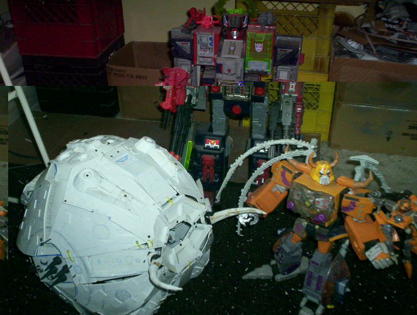 here shows planet size.not finished..w/ armada battle and deadend unicrons..as well as my decptimaxacon..fort max made in to decepticon ..one more week for planet and wings .then another week to fine tune in tooling and clean up edges ...then a 3rd week to paint photo document and make youtube instuctions video..then on ebay..in robot it stands taller than fort maxicon..even has inside acid ingestor smelter pot where spike and daneil reunite.side walls where hot rod grabed..all true to movie features..