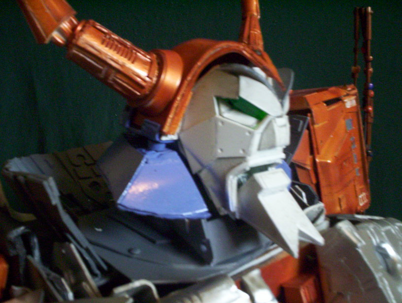 ill turn flash off next time i take picture of eyes lighting up.. but you can see a bit... has top helmet clamps purple will be orange crome..debating whether to paint jaw chin grey and face white silver as i notice it painted that why at end of show when orbiting cybertron..