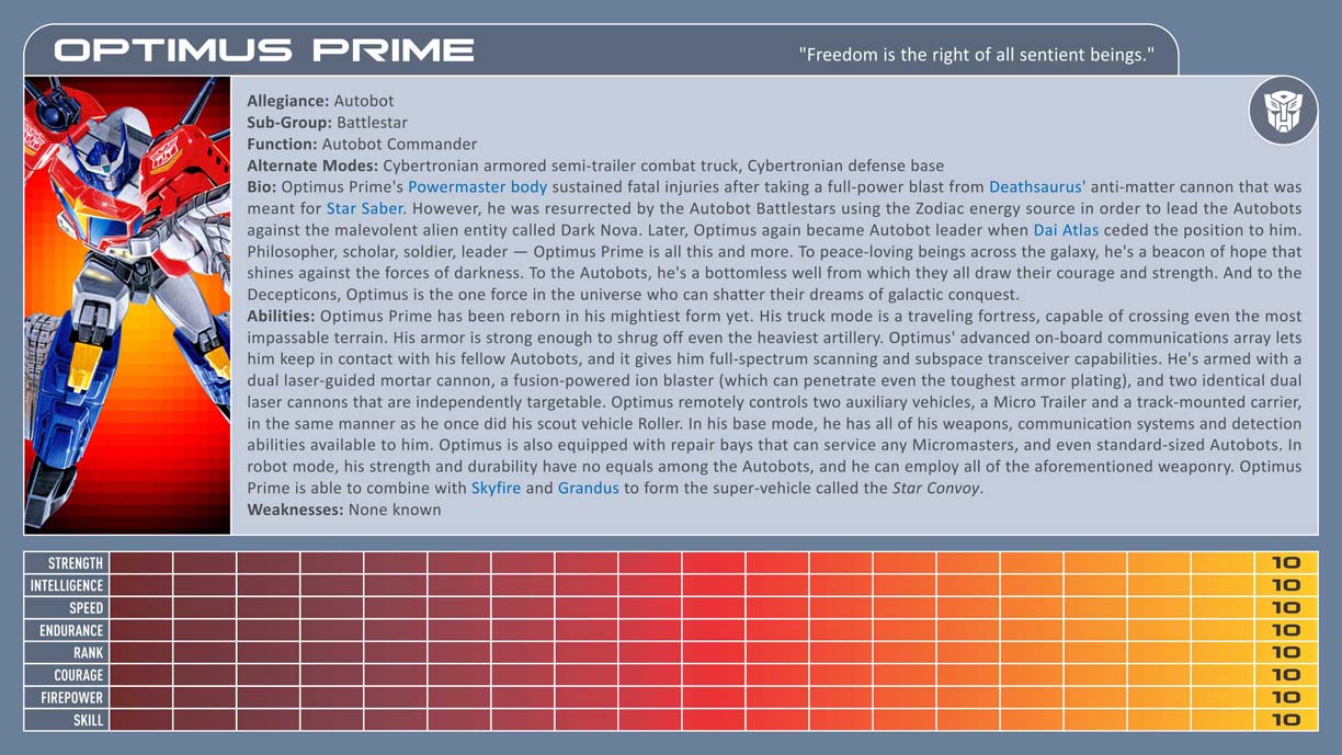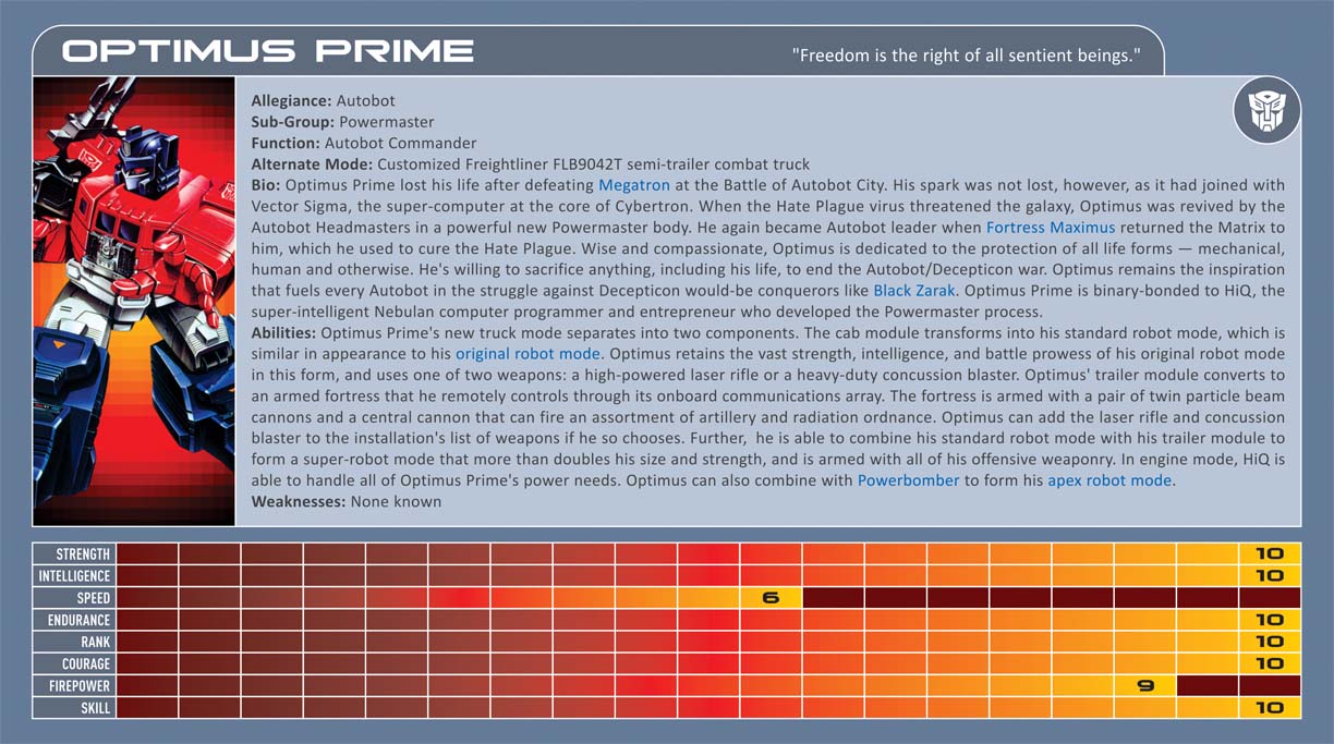 Eventually, I'd like to make this PDF accessible to everyone here. Here's a sample of the original Optimus Prime's entry for everyone to look at. I'd appreciate any feedback that you folks might have to offer