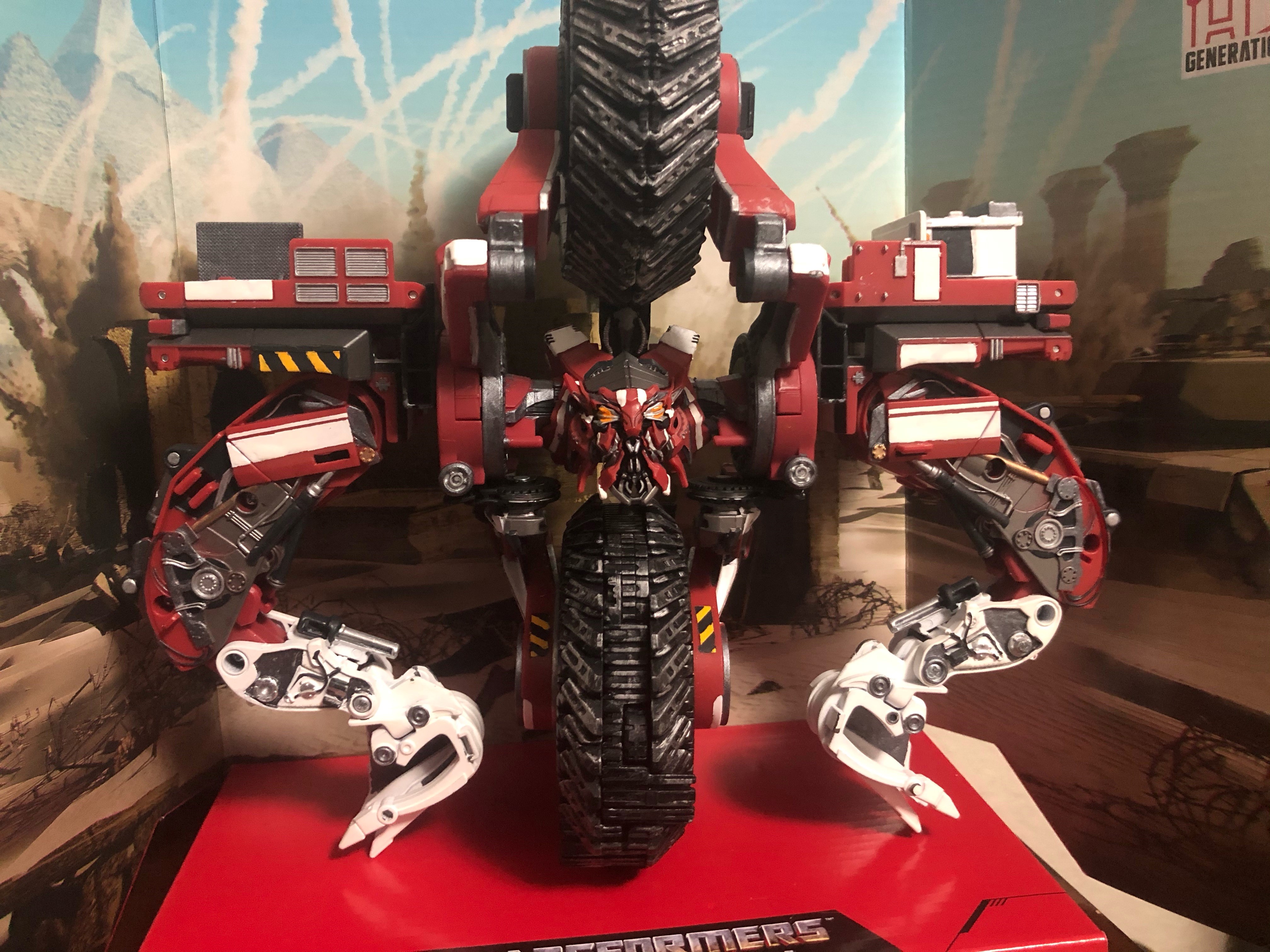 The key things I knew I wanted to do going into this were the white excavator scoop/forearms, the white with the pinstripe on the shoulder panels, and orange for the eyes. From there, I took some inspiration from Demolishor with the striping on the support struts for the wheels and a lot of the paint on the head. Various gunmetals and silvers were used, as always. The wheels (and the treads in alt. mode) were dry brushed silver, and the overall figure was sprayed with a flat coat (I figured that would work with the Excavator better than gloss. . . and I'm also currently out of gloss coat).