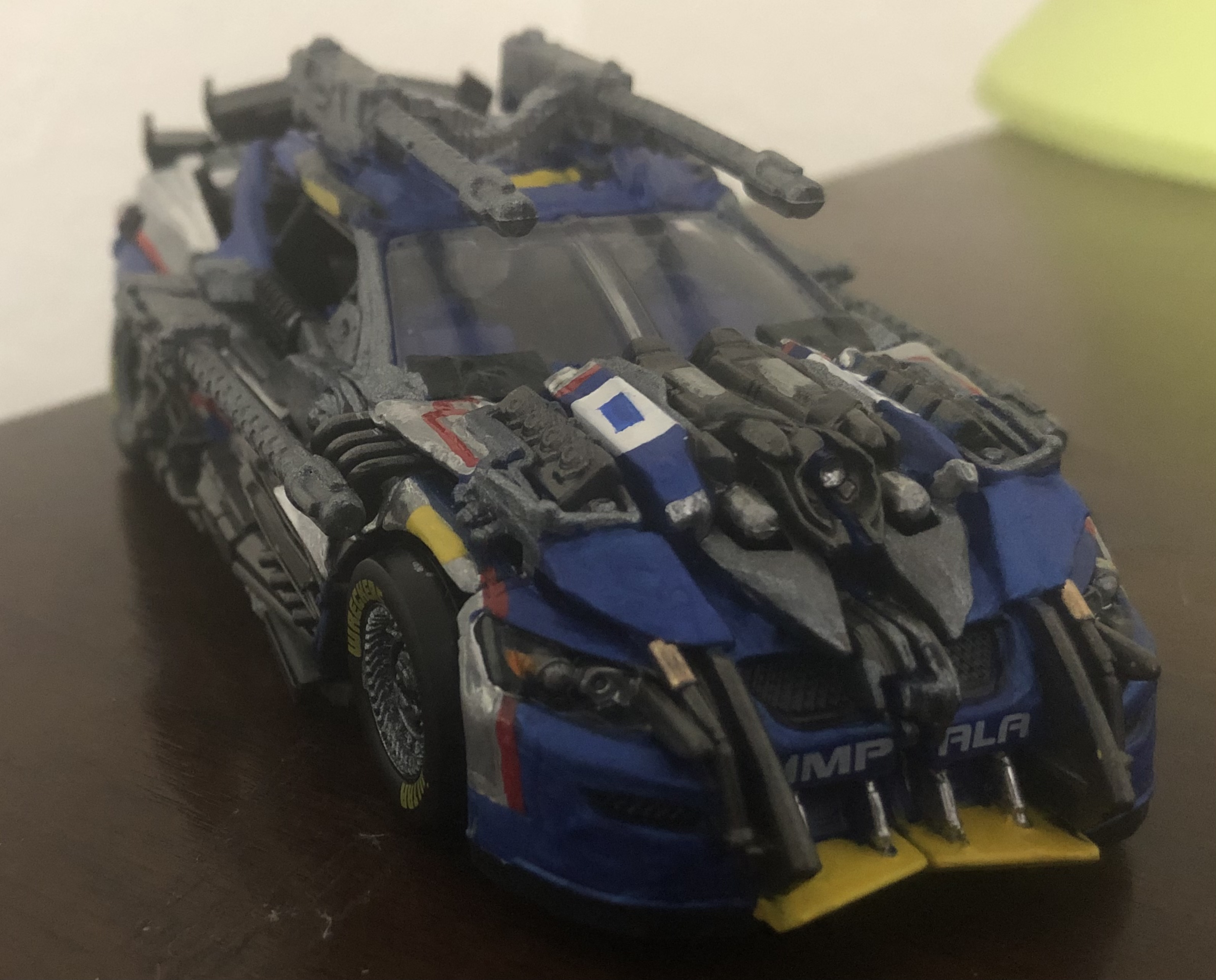 As with robot mode I repainted the entire car in gloss red. I also added gunmetal to the bottom of the doors and to the grill matching the actual car. I finished with the rear of the car, painting new headlights, the exhaust pipes, and the license plate.
