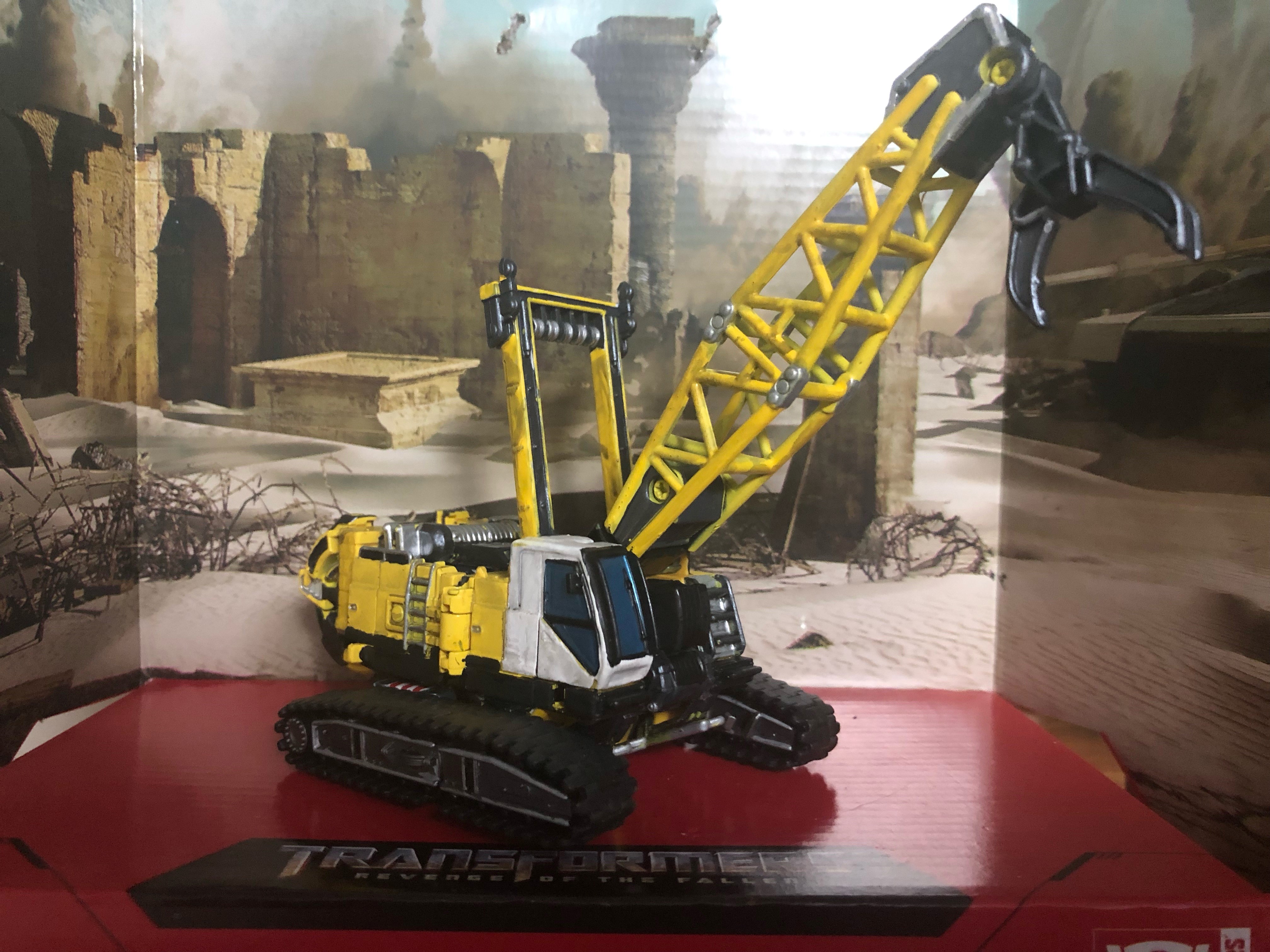 For vehicle mode, I went with a lighter yellow base coat to better match the on-screen vehicle. I wasn't sure how to feel about that at first, but I like it and I think it adds some more variety to the Constructicons who have a lot of yellow going on. I painted the cab section in white, again based on the vehicle we see in ROTF, and added details primarily in silver and a flat black. The crane arm and the support thing behind it should technically be solid yellow, but I think I struck a good balance between the overall yellow color and detail work.