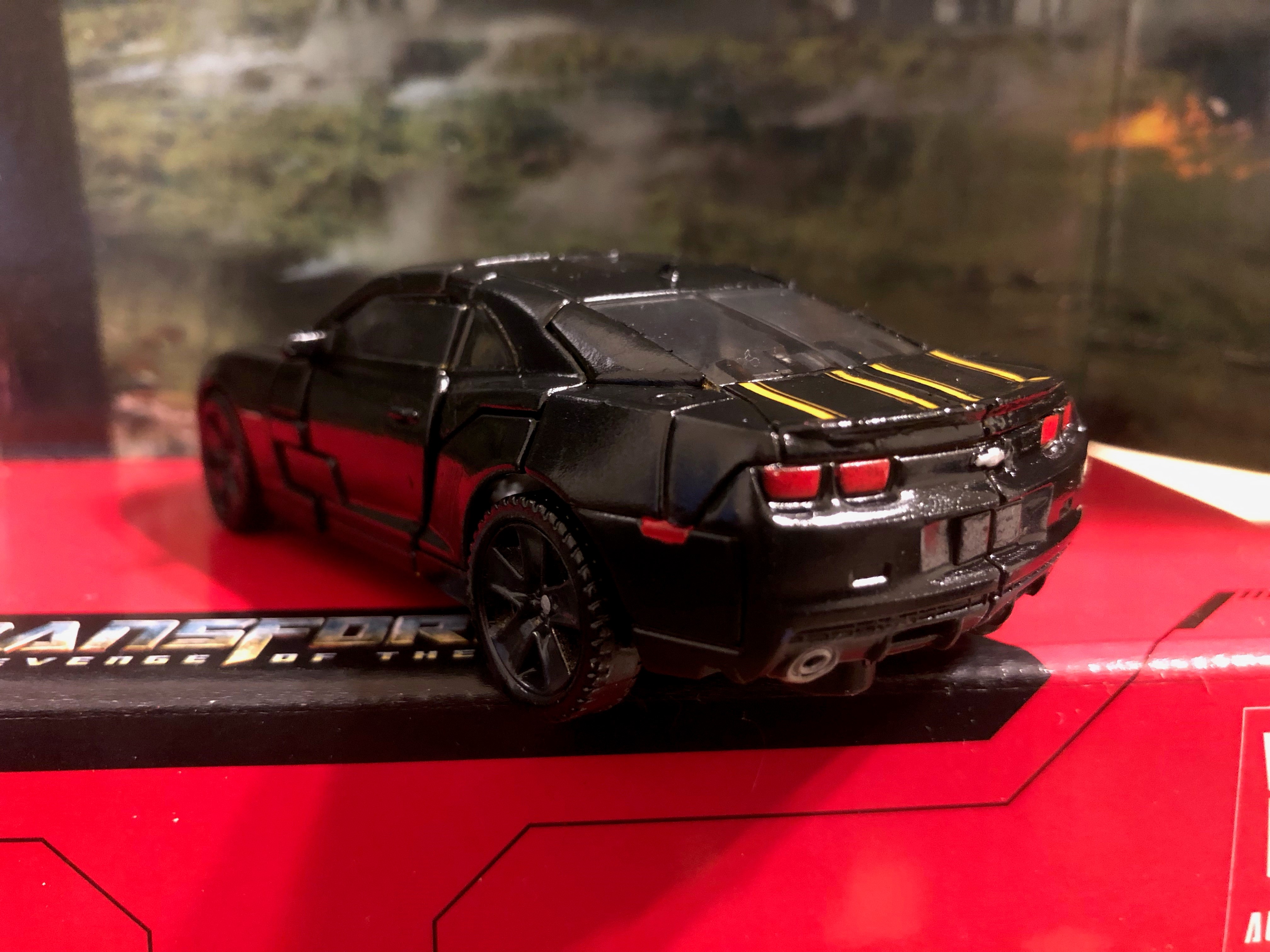 I have to give a big shout out to TFW2005's erwinsims for suggesting that I paint the outline of the stripes in alt mode - it ended up looking really cool! It wasn't as difficult to implement as I thought, I just put tape around the stripes (leaving some of the original yellow plastic visible around the stripes), and then painted/scraped to touch them up. I used flat gunmetal for the grill, hubcaps, and the lower portion on the back to stand out against the black base coat fo the figure while still fitting in the stealthy theme. I then picked out the exhaust pipes, headlights, foglights, and chevy bowties in silver; and used red and orange for the reflective bits on the sides of the car.
