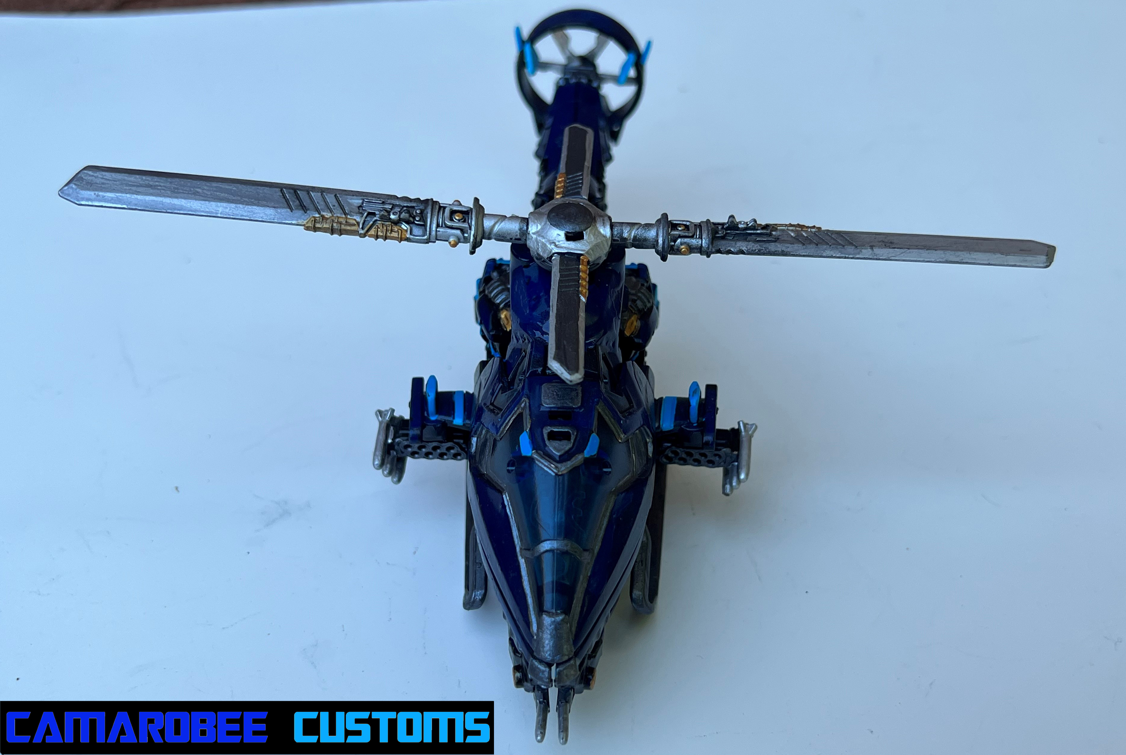Unlike bot mode, it was very difficult to get a good look at the color layout for Drift's helicopter mode. I improvised for a fair amount of alt mode, but there were details like the gunmetal at the front, gold on the rear turbine, and silver for the missiles that I was able to add based on screenshots. I had a gold outline around the cokpit, but based on footage I instead made it gunmetal.