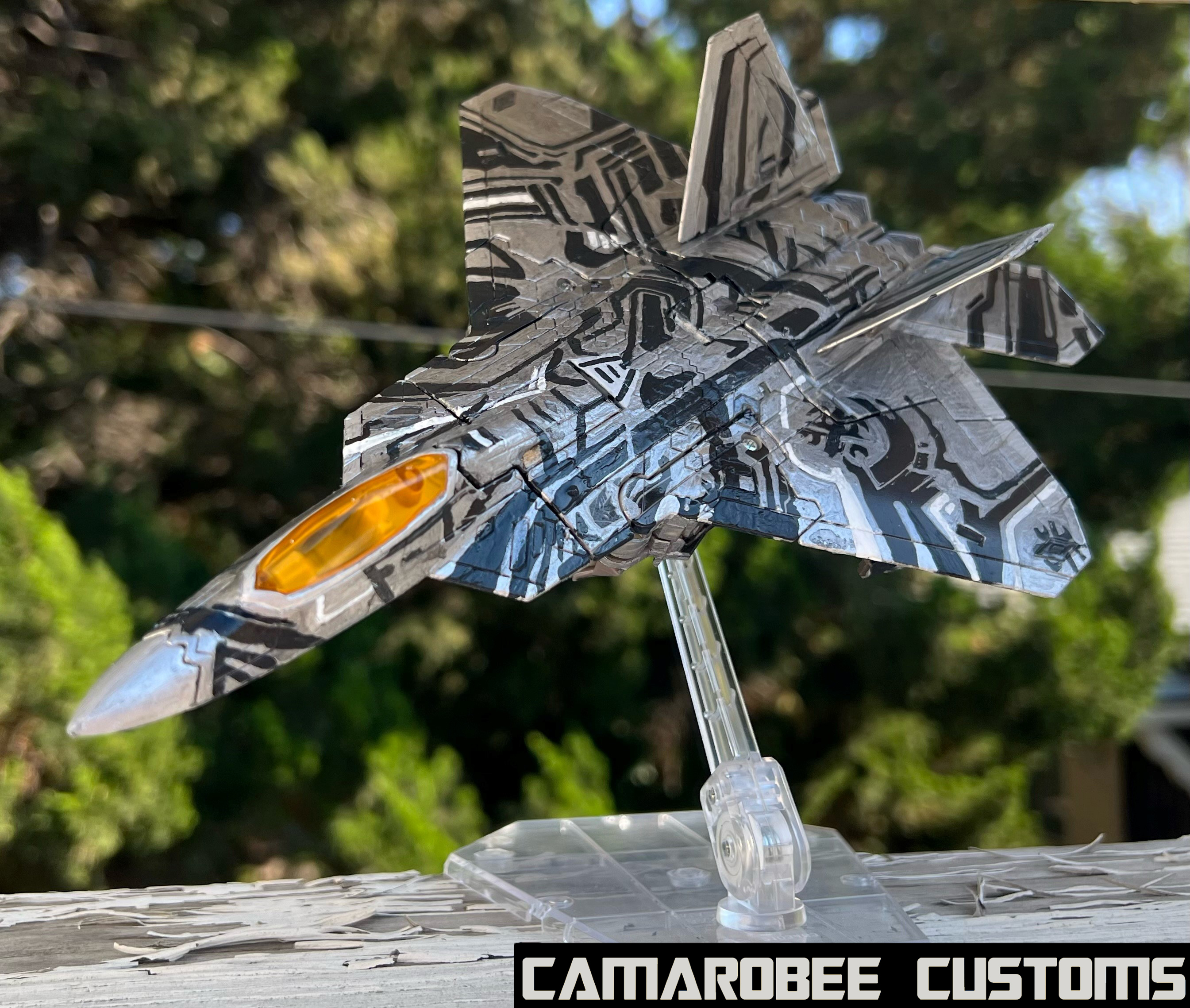 My initial plan in alt mode was to trace around the existing tattoos as I added the silver base coat, but as I came across more reference pictures I realized that the original's markings (and by extension, the markings on all official movie Starscream figures) are actually inaccurate - there are a few portions that are fairly accurate, like the inside of the vertical fins and portions of the left side of the F-22. All of the markings in the center and right side of alt mode were completely repainted from scratch. It was tough to do, but I'm really happy with how it turned out! I also did a lighter silver outline around alt mode, white for some markings and the landing gear, some gold near the engines, and the markings near the refueling port found on the standard F-22.