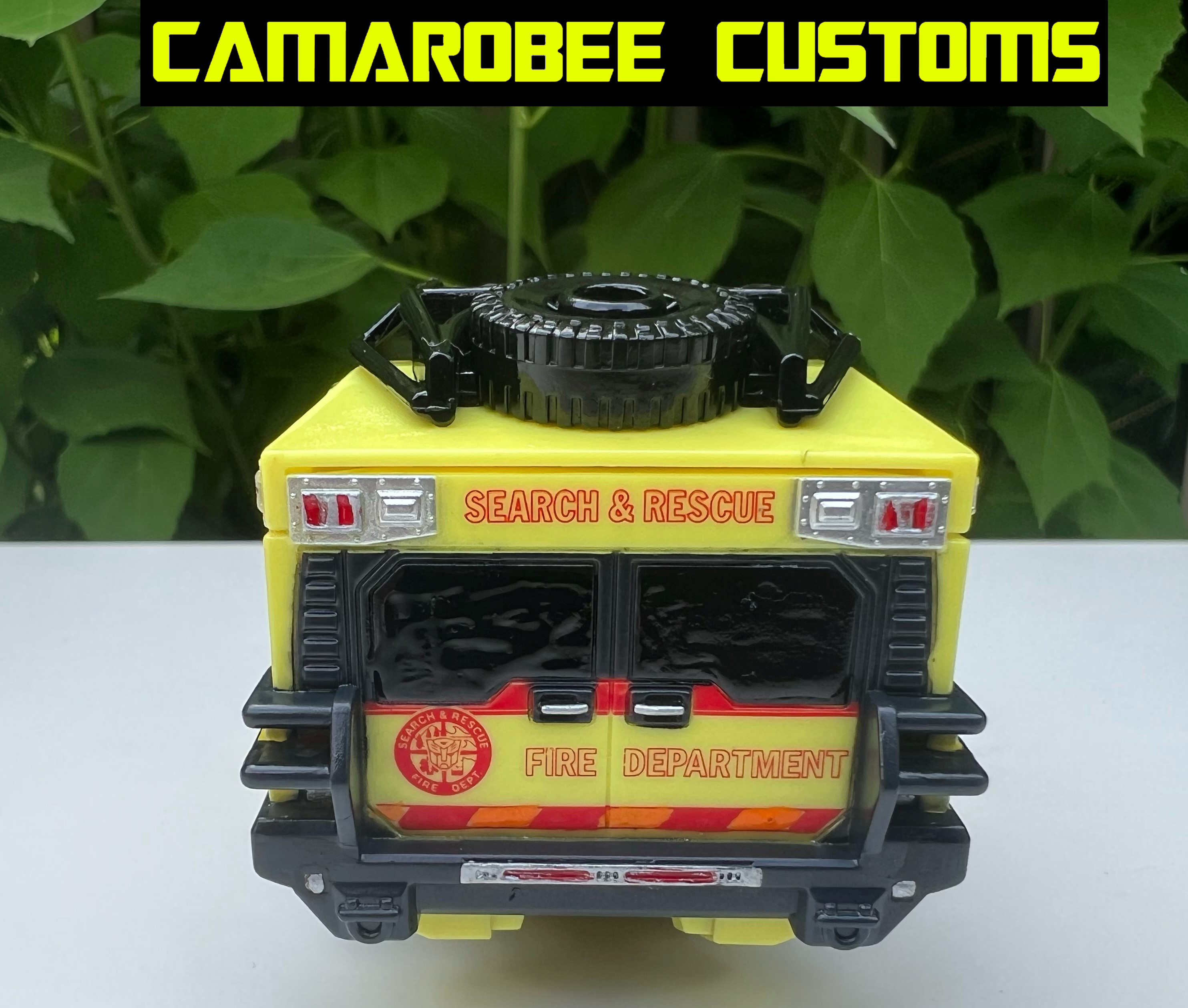 Detail work in alt mode was fun, I used a gunmetal for the lower grill with silver for the lights and winch, painted orange on the hazard striping, added a gloss black ridge to the sides of the Hummer, and picked out the numerous small lights. I also picked out the rescue equipment mounted to the top/sides. Repainting the hubcaps in gunmetal with silver accents completed alt mode!