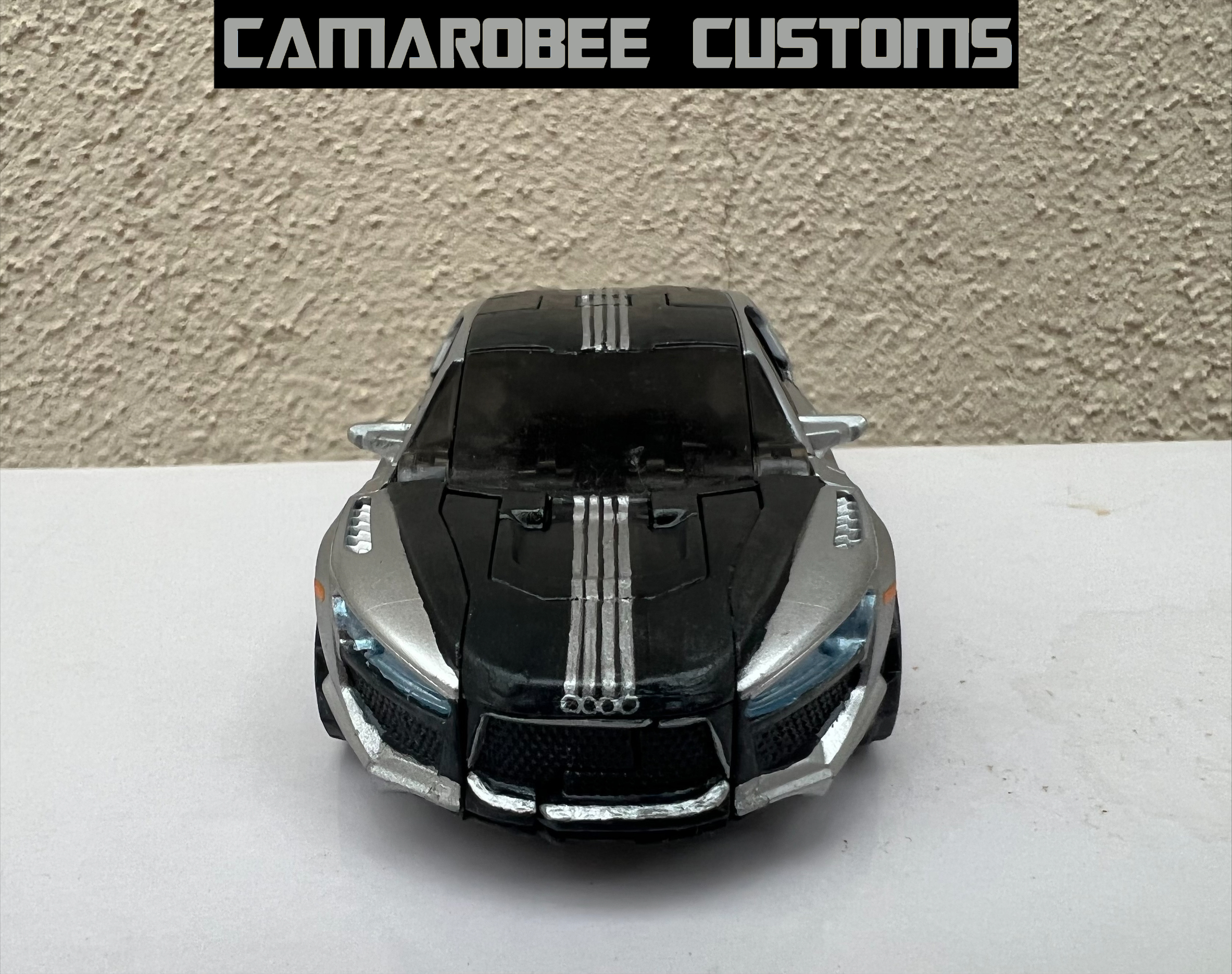 The stripes were by far the biggest challenge for Sideways, and while I had gotten a few good-looking ones via hand-painting, I decided to try decals instead, a result I'm very happy with! I painted a light blue for the headlights orange for the reflective pieces on the front, got an audi logo (or as close as I could get) to the front of alt mode, added silver trim to the grill, and redid the paint on the back of alt mode to be a little more accurate to the on-screen Audi R8.