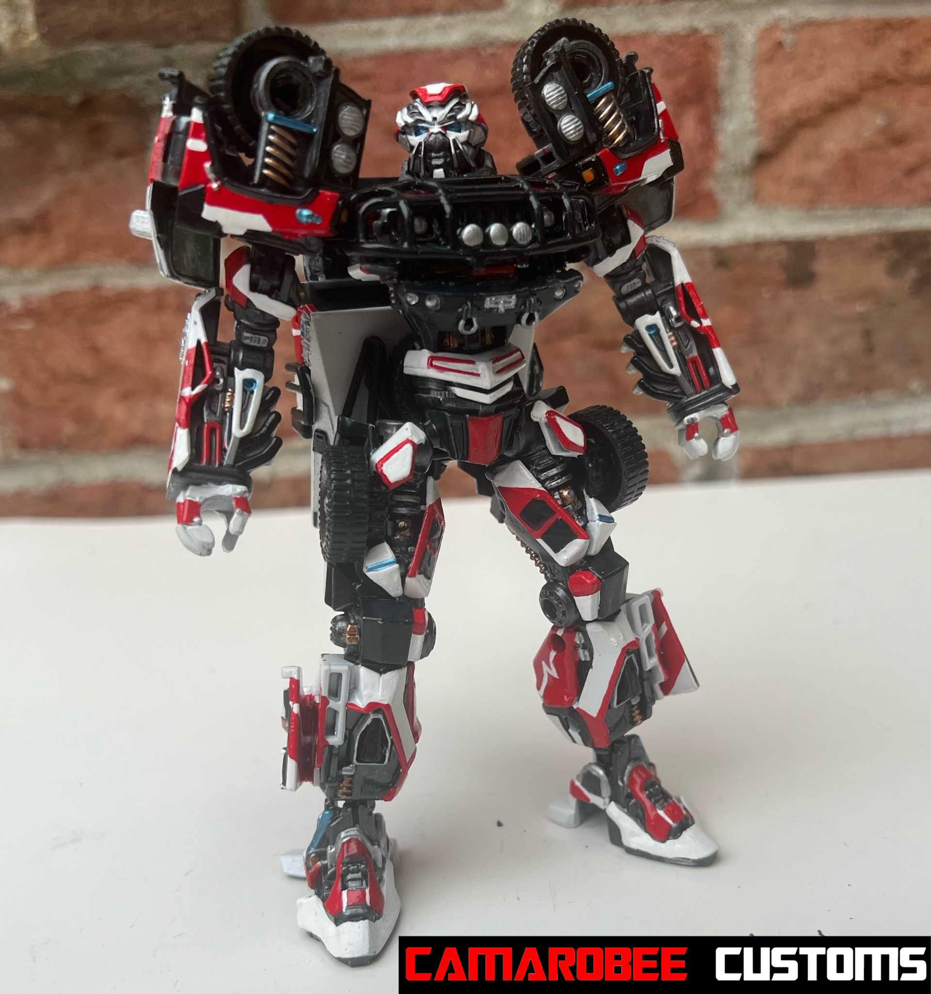 Starting this repaint off, I have to admit I'm generally not a fan of most G1 decos on movie bots. I wanted to see with this repaint if I could adapt the G1 color pallette in a way that complements the movie design more. I used white, red, and various gunmetals for more color breakup, and while I did use the ROTF video game skin as a basis (which I'll talk about more in alt mode), I really wanted to see what I could add. I pulled some details from my NEST Ratchet repaint with the EKG markings on the legs, and tried to add some more variety with metallic blue and copper!