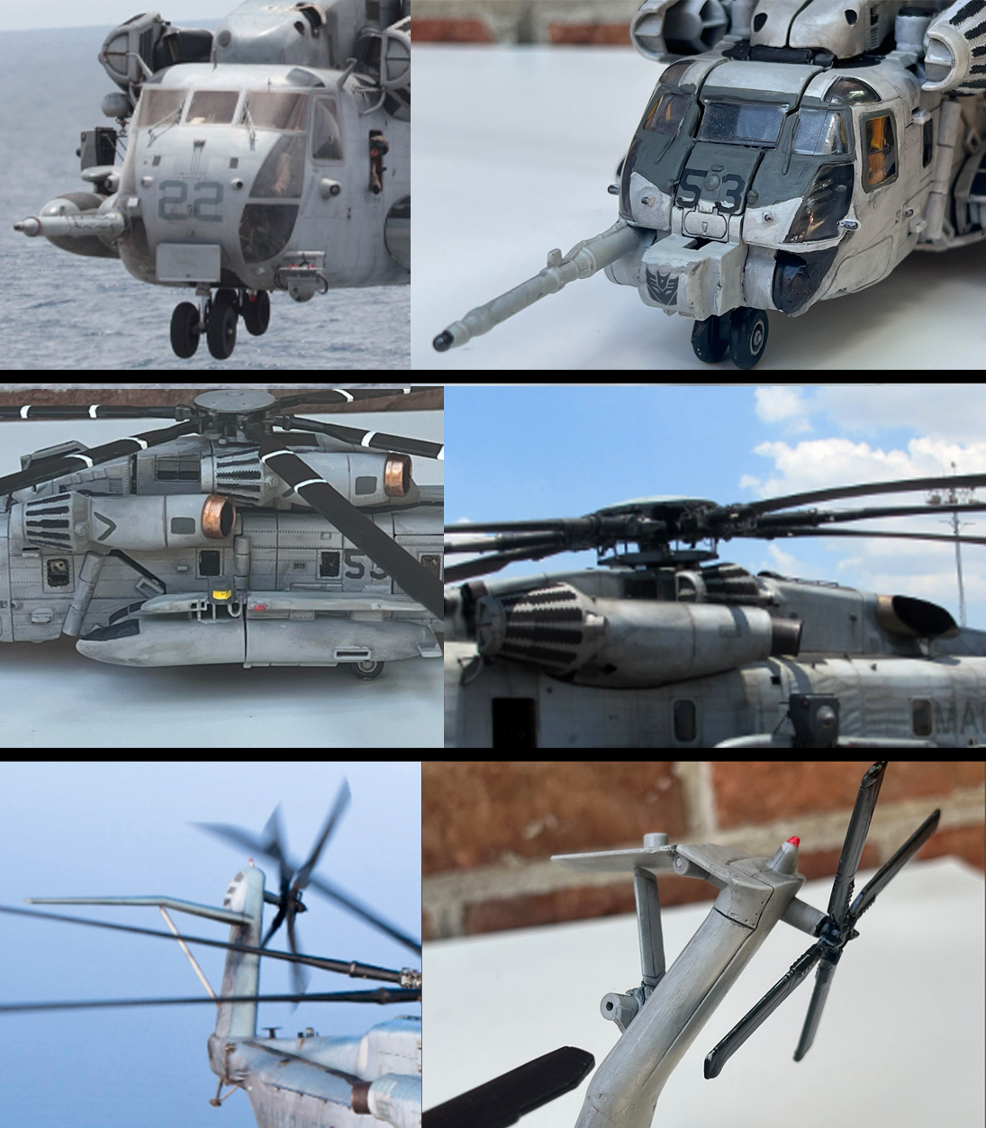 Now looking at alt mode, most of my time spent on this project was spent on figuring out the modding. First up is the nose of the helicopter, which saw the removal of most of the lower section to get it more accurate to the CH-53. I did have to leave the central portion so the upper and lower body sections can connect in robot mode, which is largely unavoidable if you want him to still transform but still makes it more evocative of the proper helicopter. I then sanded down the part of the right side cockpit below the lower window and painted on a new window sitting below that one.