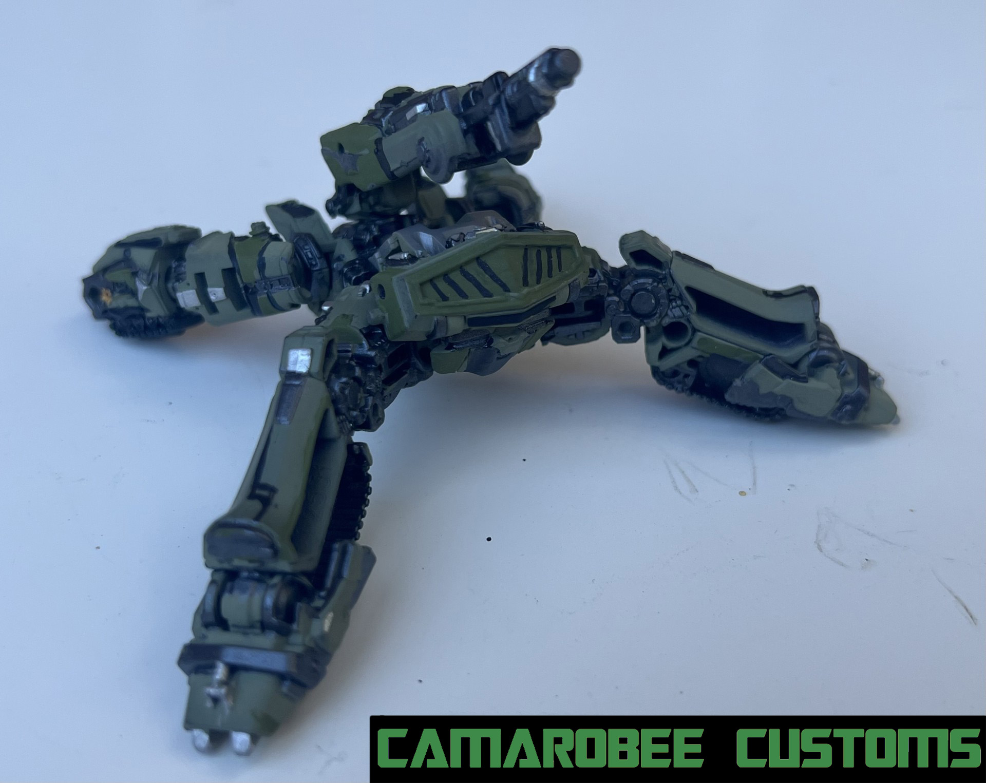 Since these two Shockwaves have very different robot modes, I wasn't able to map details directly from the concept art, but I did my best to evoke that art with the basis of this figure. I started with a flat green base coat, and added gunmetal throughout. The key details I wanted to bring forwards were the helicopter canopy on the lower chest and the blast shield chest. The lines on the chets were definitely the most difficult part!