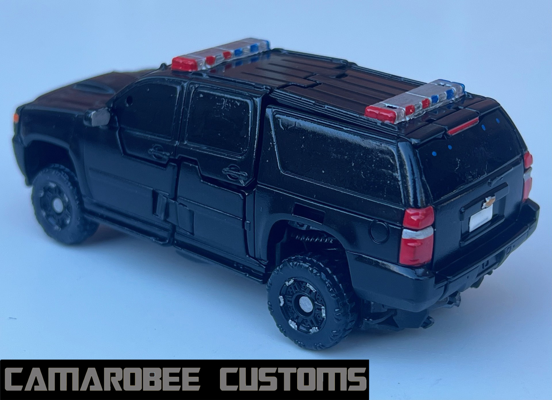 It was interesting working on the Dreads in alt mode since they're identical! I started with a gloss black spray paint over alt mode, and then a flat coat to get a look more like the actual vehicles. I used gloss black (without the flat coat) for the windows in alt mode to help them stand out from the rest of the vehicle. I painted the lightbars in silver with metallic blue and gloss red for the lights. I added that same red and blue for the lights in a few other places as well - on the mirrors and grill. I picked out the tail lights and headlights with their corresponding accents, the Chevy logos, and the tire detailing. The last thing I added for alt mode (and actually the most difficult part) was the silver trim around the grill, getting those lines to look good took a while!