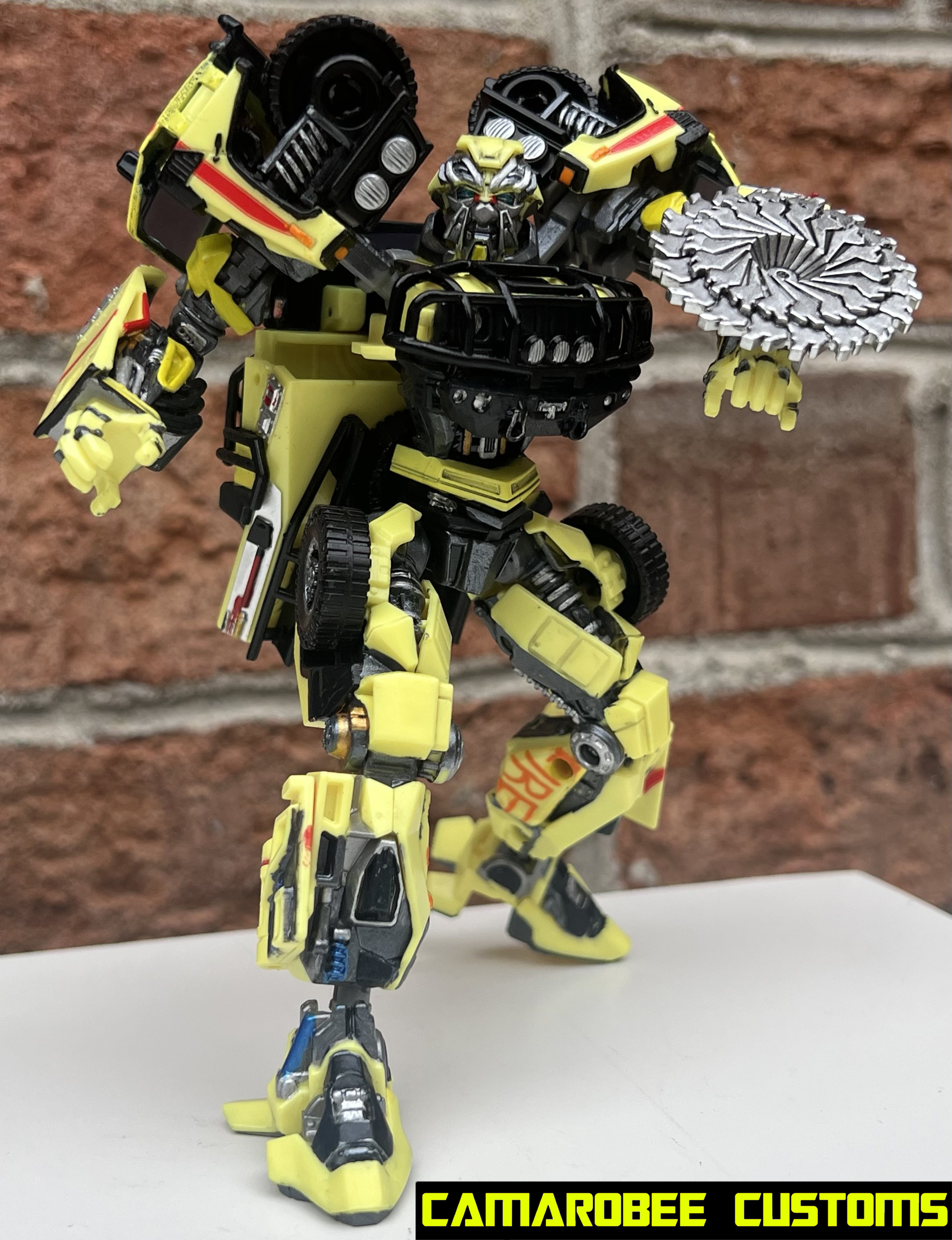 I found a shade of yellow paint that matches the figure's base color pretty well (It is a more metallic color in the movie, but this gets fairly close so I stuck with it). I used my usual gunmetal throughout, with some silver and gold accents. There's some metallic blue on the leg pistons, and orange for the "FIRE" text on the legs. Some darker gunmetal was used throughout as well, and I added some gloss red accents to the head and arms. For the sawblade I just used a wash, and used the same paint colors from the main body for the weapon.
