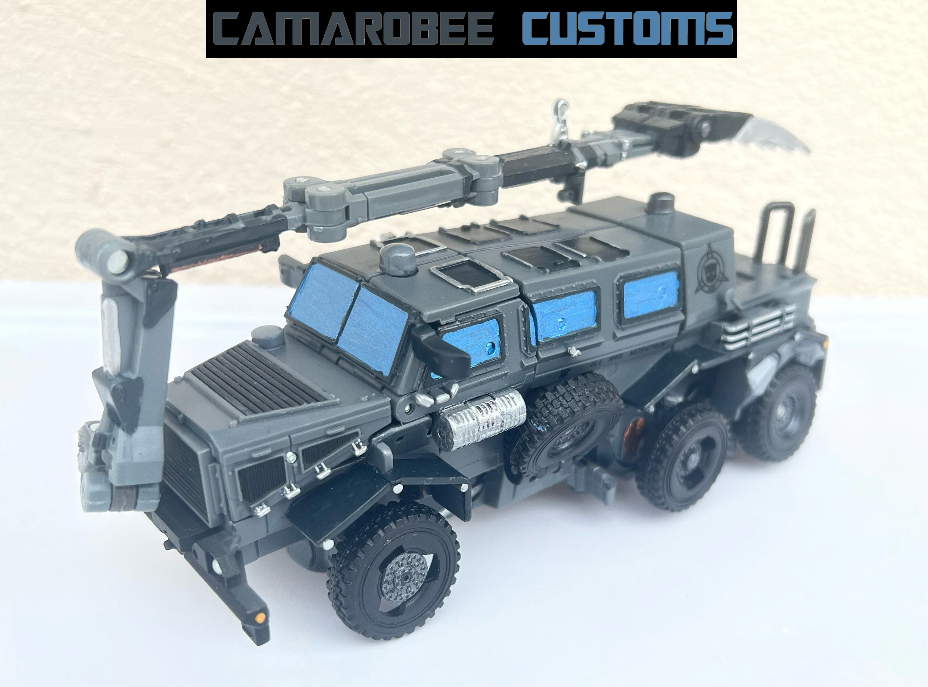 Continuing the trend I set with the other NEST figures, I hid the green details from robot mdoe with the exception of some lights on the front. I added a flat gunmetal trim to the alt mode like the other Ratchet designs, and added some silver detailing throughout. I decided to keep the tools in all silver to keep more in theme with the NEST repaints, and I detailed the center of the tires. The blue roof lights are a reference to the ones found on Ironhide's alt mode!
