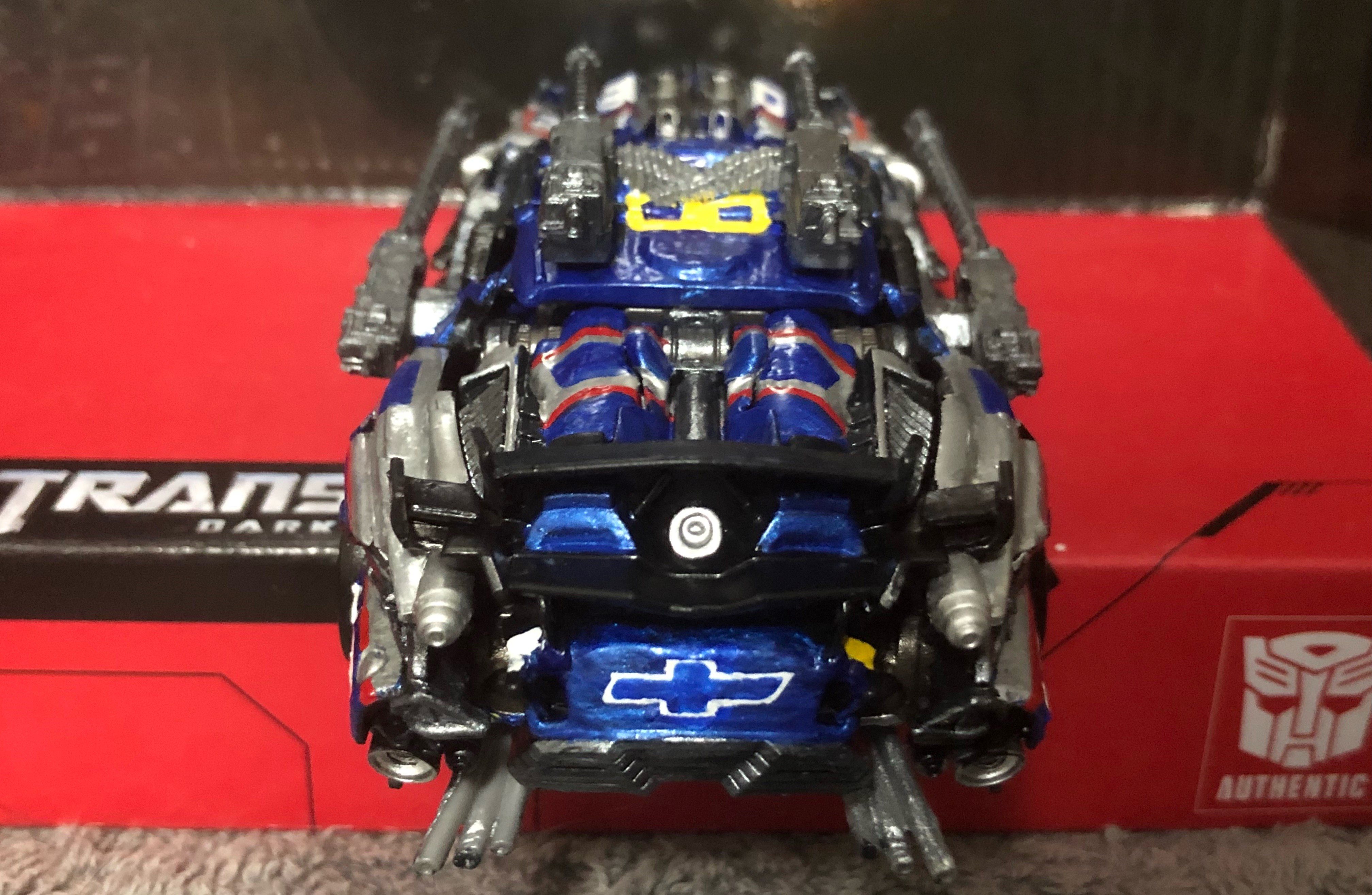 Our main improvement for alt mode is, of course, the new metallic blue from Tamiya (I think my first project using a Tamiya paint, but not the last!). There's a lot of additional detail work here though, with the lights on the front, the grill, the Chevy logos, and the black trim. New things I added with this update are the tail lights with a black center and red outline, and the blue section below the side windows that is different from the metallic blue covering the rest of alt mode.