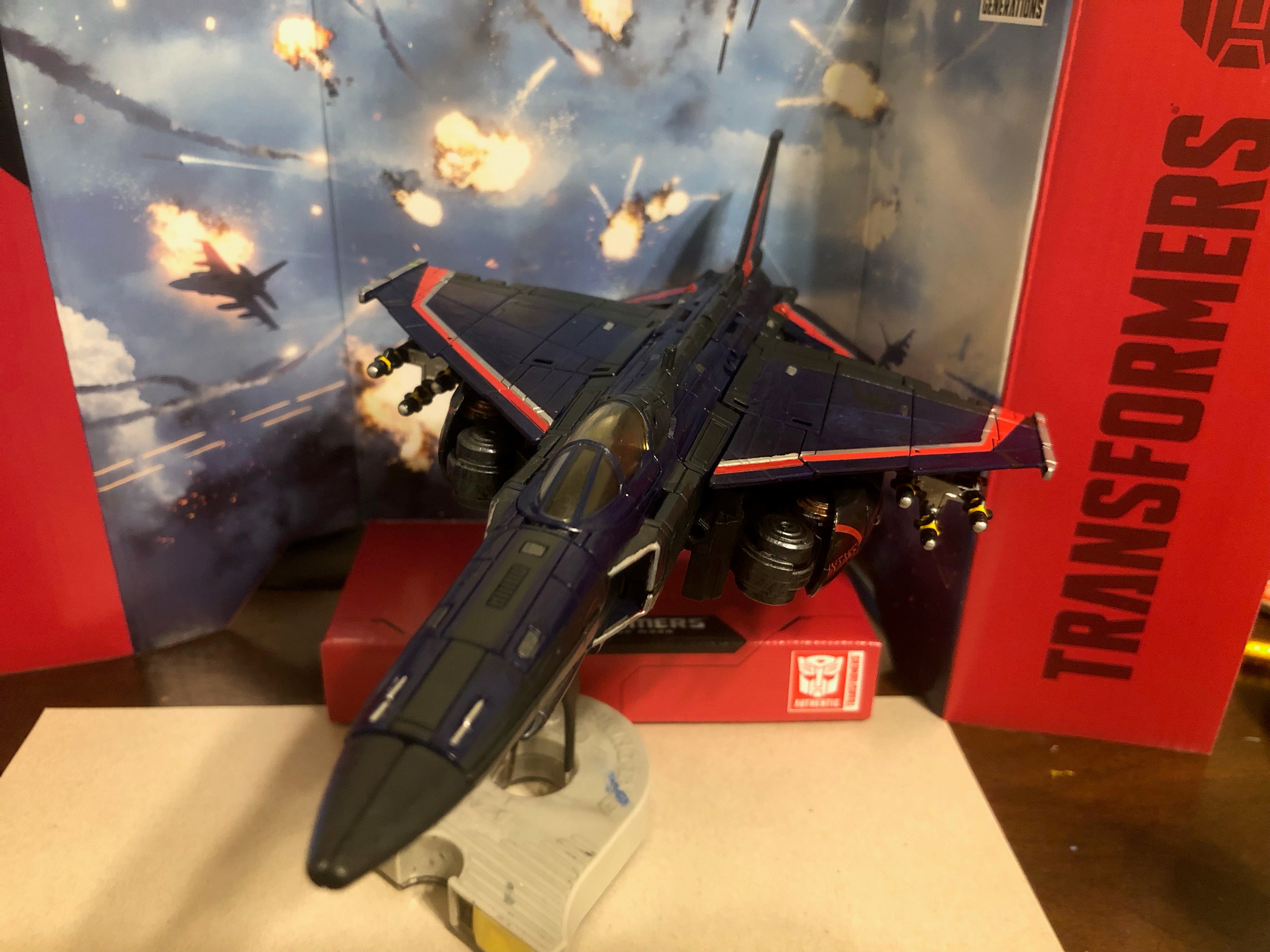 My first goal in alt mode was to integrate the gray portions of the wings to the rest of the wing. I painted over all the blue surfaces of the figure with gloss dark blue (since I couldn't quite color match the original), and continued the stripes with the help of some model tape. I then used lots of flat gunmetal on the sides of the fuselage, a stripe down the middle, along the intakes, and broad portions of the wings to add more interest than just the blue. I added small amounts of red and silver to continue the thunderbolts on the tail fins, and various silver details.