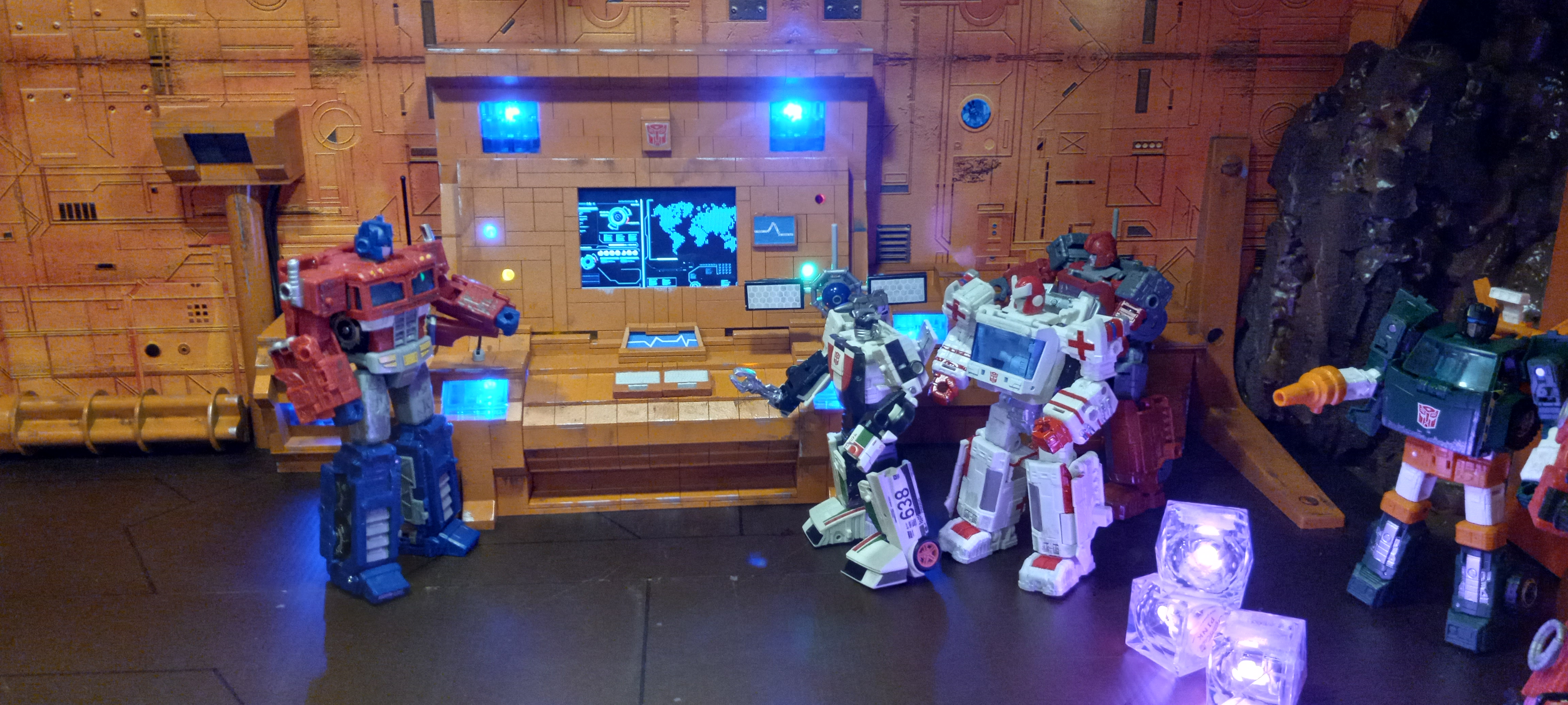 So without further ado, here it is. It is a behemoth, 8 feet long x 4 feet high x 4 feet deep. 3 display platforms that come together to form 1 giant diorama/playset. Moving parts include the Teletraan-1 viewscreen, computer module on the side piece, sliding blast door, a rotating turret under the outside tunnel entrance and a removable sky spy. LED lighting includes the Ark interior ceiling, and the tunnel and entrance walls with a traditional outlet plug.