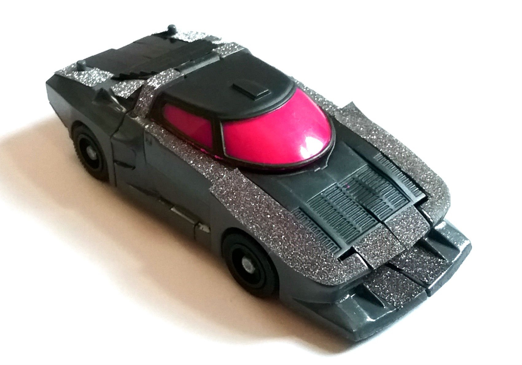 Yet another G2 repaint this time it's my old beat up Wheeljack figure. Though I've never been a big fan of the character Wheeljack's design is hands down one of my favorites...so alien looking. I decided to play off this and give him a UFO kinda look so no retina piercing neon colors. Instead I opted for "dark G2 Sideswipe" approach. The silver glitter decals is washi tape from my wife's art journaling stash. I know it's definitely not going to be for everyone but I thought it was more interesting-90's extreme-UFO like than just painting it silver. More stickers to follow.