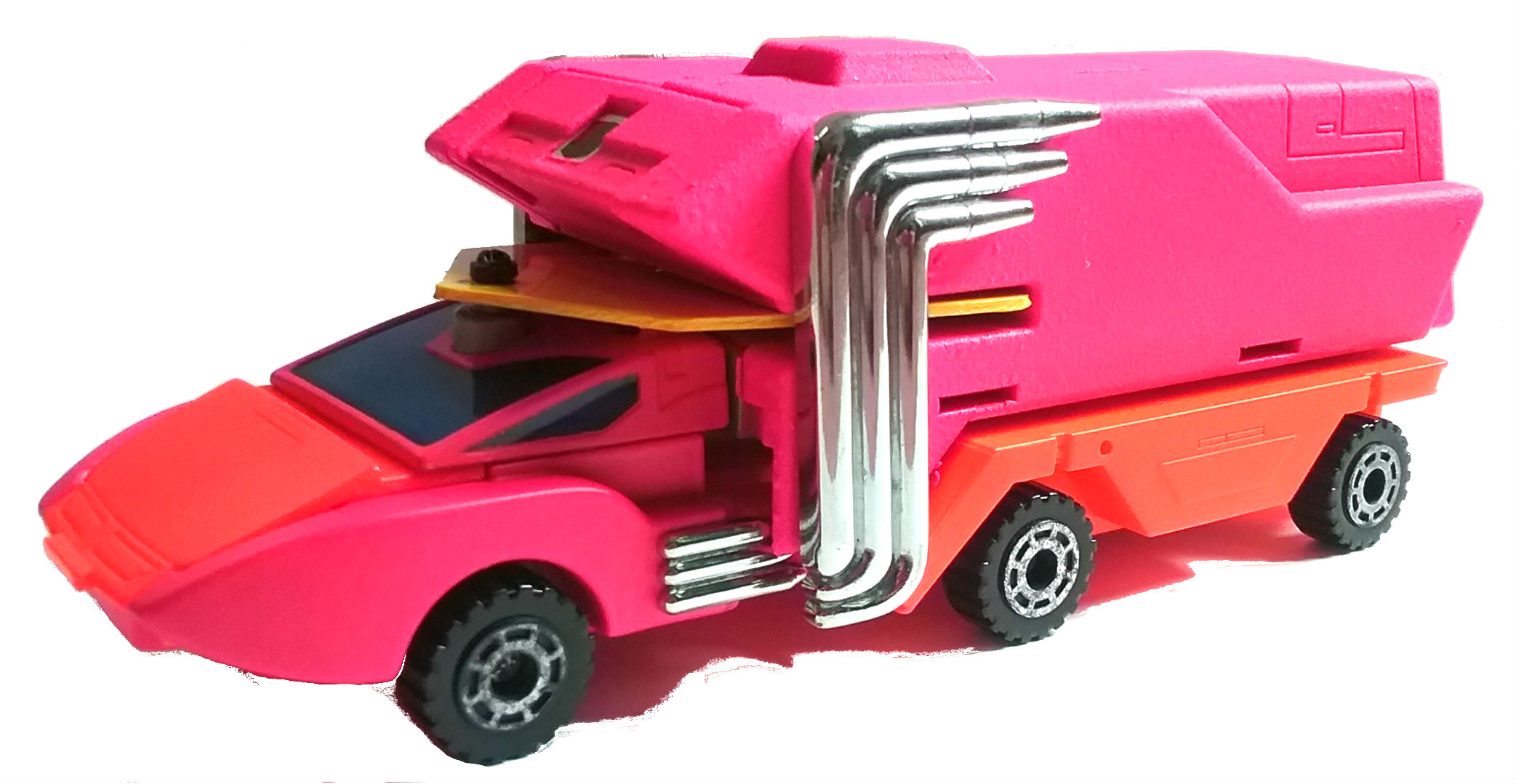 My final G2 entry (at least until I find more G1 junkers). I've been wanting a pink and orange Hot/Rodimus Prime since '86. Since Hot Rod was more purplish in the G2 comics I decided to go with Rodimus. He's kinda plain without any stickers but until I decide on what colors to use (and get my printer working) these oics will have to do. In case anyone is wondering what's up with the spoiler, this figure didn't come with one. I had to cut one out of a plastic kids plate and attach it with an old Bionicle peg.