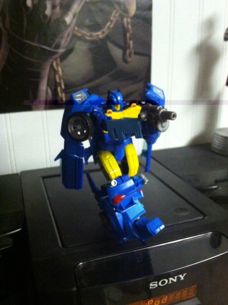 But when I finally got my hands on him, I found him...lacking. Rather, I found the minimal paint apps lackluster. Most of the toy is colored only by the plastic used in the mold, and what little paint is there is only on his forearms, the wheels/tires (which look nice, actually) and any of the yellow detailing. Now, the color used on the arms is actually a nice shade of blue, but as anyone who tries to paint yellow over a darker color knows, it requires more layers than Habro applied.