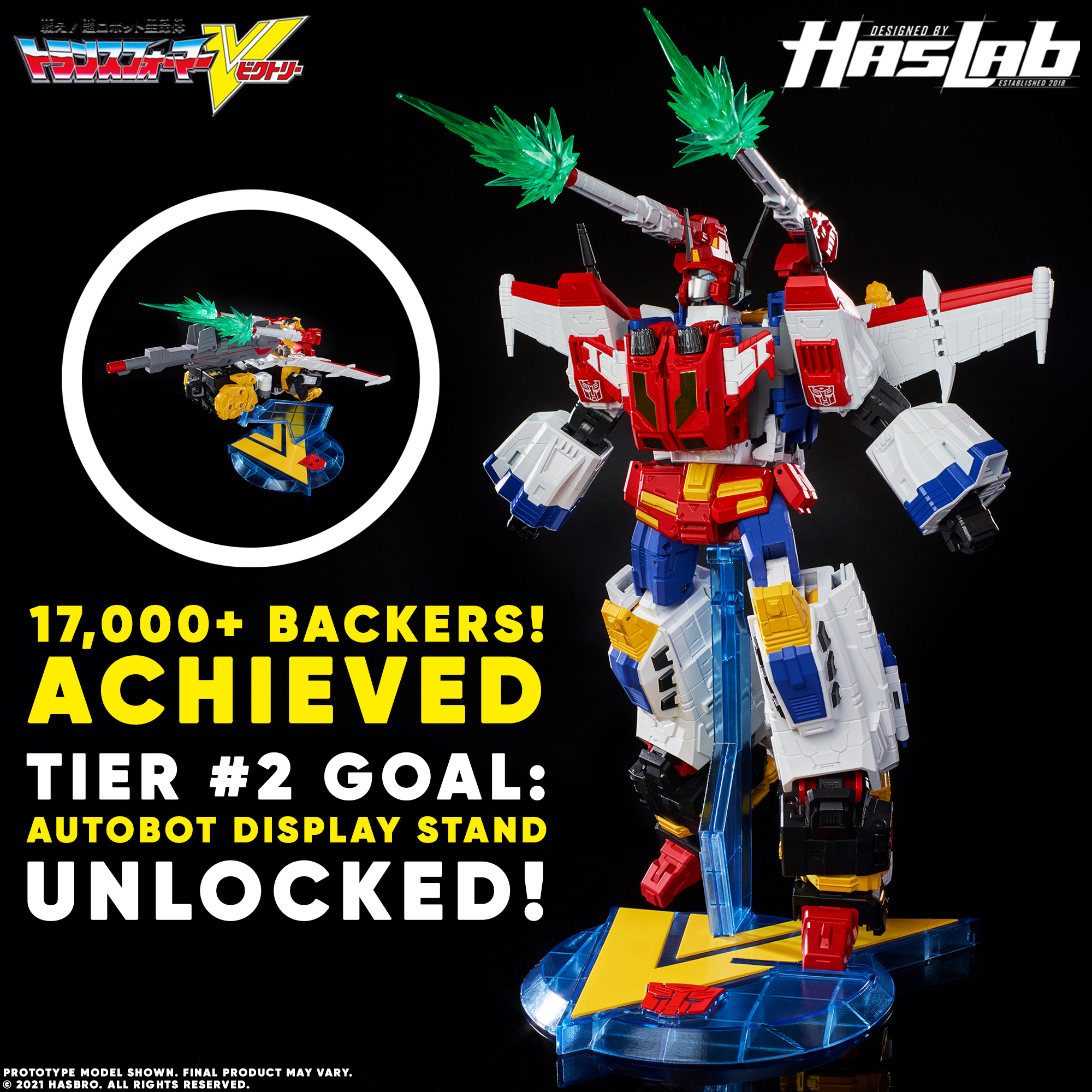 Onward to Victory! Thank You Fans!!! We have reached the 17,000 backer total and the Tier 2, #Transformers Victory Autobot Display Stand is now included with your HasLab Victory Saber. Now you too can display your Victory Leo in alt mode with all Tier 1 and 2 accessories seen here. There’s still time to get to 20,000 backers and unlock the V-Shield, Micromaster Holi, and Micromaster Fire!