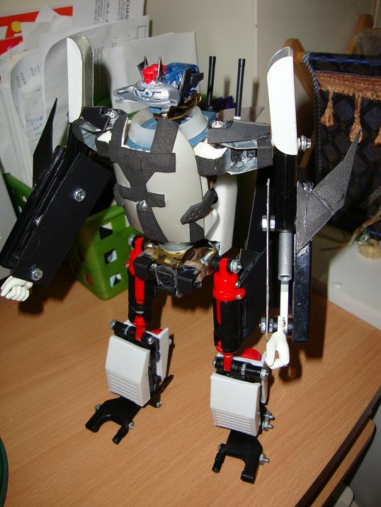 This is an update of my 1st ever attempt at a scratch built project. I wanted to make it completely out of non transformer related or styrene plastic stuff. Accept for the hands this was made completely out of house hold objects and odd ends you find in a tool shed bin. I'd like to finish it up by adding landing gears & eventually paint it. Please give feed backs and advice. Video coming soon. Thanks again!