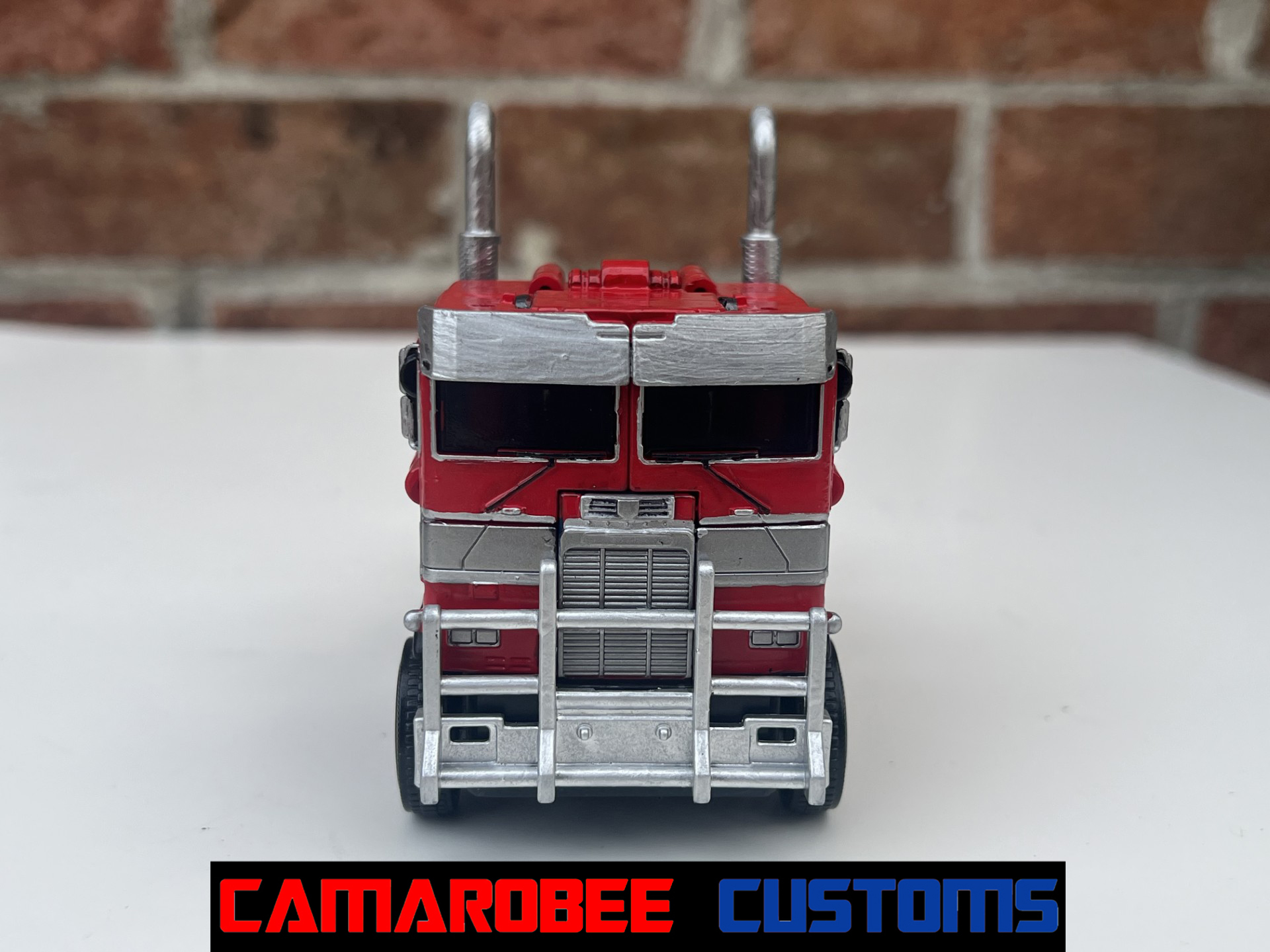 For alt mode, I started off with gloss red and a similar blue mix to my last few Prime customs and repainted all the original red and blue sections. I then went and added new flames, both the layered ones over the back wheels and the small ones over the side windows. I also redid the flames over the front wheels to get them more accurate. I then repainted the side sections and exhaust pipes in silver with some gunmetal accents, and moved to detailing with the silver pieces all over. I repainted the lights on the front with black, silver, and orange, and painted the grill with black and silver. For the truck bed, I painted it primarily in black and silver with red lights on the back. The final gloss coat really amplifies the metallic blue paint, completing this mode!