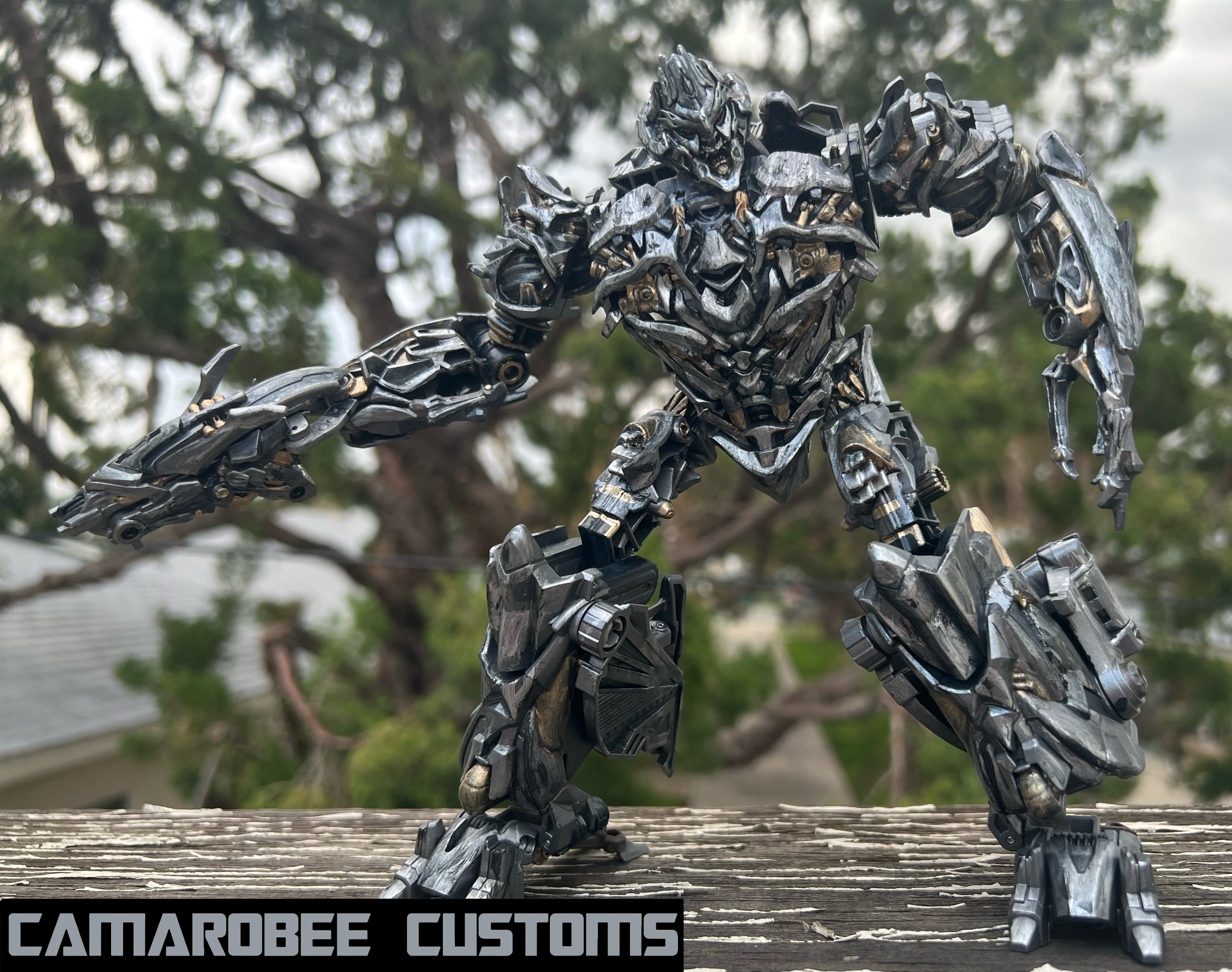 Starting off, This project used the PF Megatron as a base, but it was mismatched with the regular DNA Design upgrade kit since that was the only one I could find in stock. The premium finish is a very nice upgrade to the original figure's paint work, and the basic formula of a light gunmetal base with silver dry brushing on top is something I carried forward with some extras. To match Megatron's pale gold secondary color, I mixed my acrylic gold with silver to get a more subdued shade, and added it throughout based on movie screenshots and the Prime 1 Studios model. I completely repainted the upgrade pieces with the gunmetal base and silver dry brushing to match the rest of Megatron. I then added weathering via a model wash I made myself with Testor's enamel flat gunmetal and some enamel thinner, applying it generously all throughout the figure. I then moved to another type of battle damage by dry brushing and blotting that same dark gunmetal. A few of these details, particularly those on the collar pieces, were added based on movie screenshots specifically. I finished up by adding the cyberglyphs to the sides of Megatron's head!