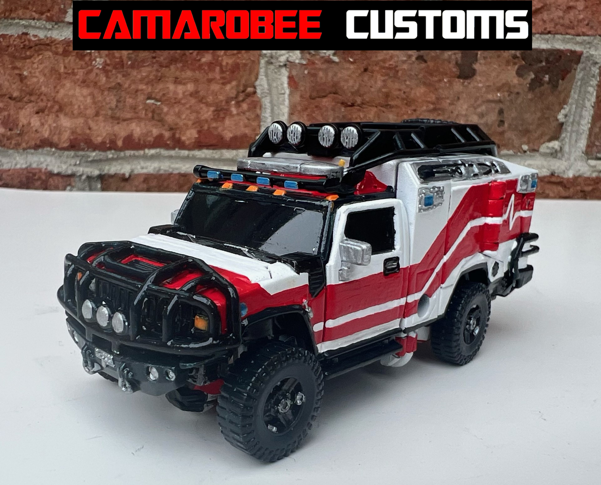 While robot mode was largely improvisational, my work in alt mode was heavily inspired by the Rescue Ratchet skin in the ROTF console game, which in turn was based on the 2007 toyline's Rescue Ratchet repaint. I started with the white spray paint base, added gunmetal trim, and then painted the red sections, trying my best to get the lines straight and symmetrical. I detailed with gunmetal and silver, and adapted the white line on the side to be a more accurate ECG shape with a P wave. With some metallic blue accents, alt mode was complete!