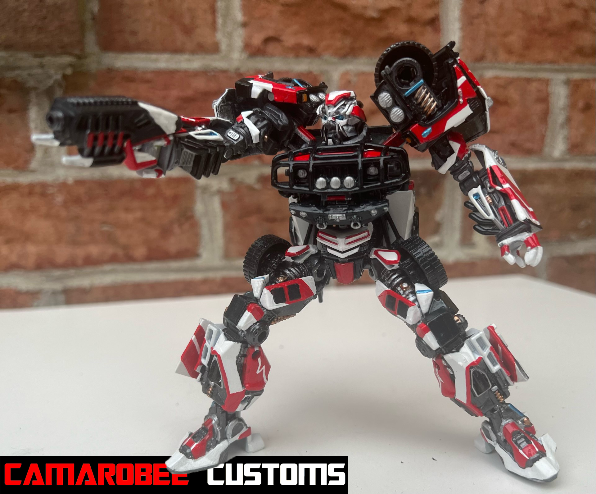 Starting this repaint off, I have to admit I'm generally not a fan of most G1 decos on movie bots. I wanted to see with this repaint if I could adapt the G1 color pallette in a way that complements the movie design more. I used white, red, and various gunmetals for more color breakup, and while I did use the ROTF video game skin as a basis (which I'll talk about more in alt mode), I really wanted to see what I could add. I pulled some details from my NEST Ratchet repaint with the EKG markings on the legs, and tried to add some more variety with metallic blue and copper!