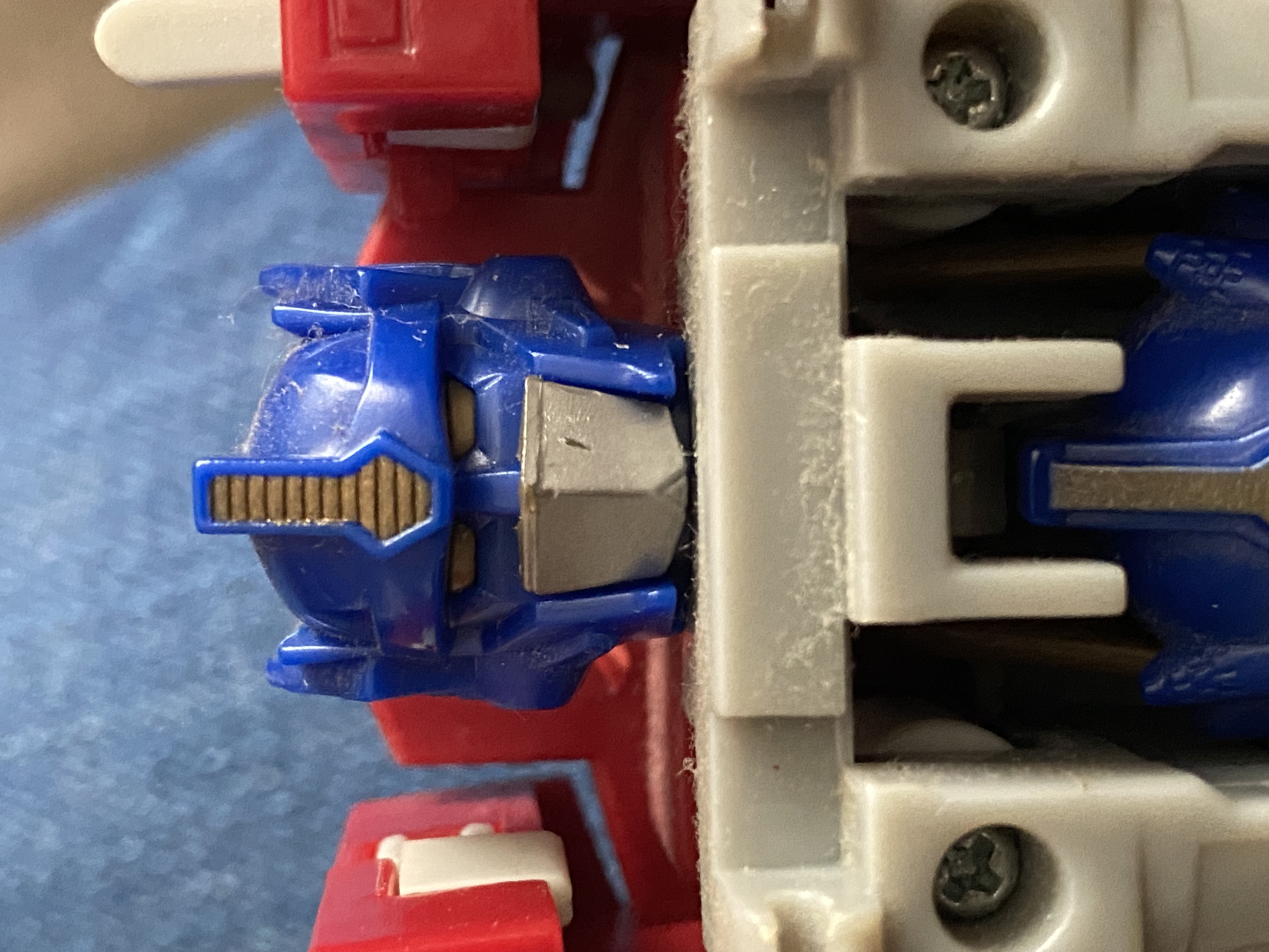 ZeldaTheSwordsman wrote:So, you've never noticed the grey tab pieces he has sticking out of his shoulders? The ones that even poke through the truck grille in vehicle mode? That's part of what I'm talking about. There's also a piece unique to the left shoulder, not sure whether to call it a tab or a button. You can see it here, it's close to the surface of the truck hood (and seems to line up with another piece in super and truck mode):Overcracker wrote:Not sure what you mean by the “tab pieces of the left shoulder” exactly,I appreciate the thought, but I'm afraid those photos are no help. Seeing just the outside isn't going to cut it here. I need to see what the internal shaft of the mouthplate looks like, what those two gray parts in the left shoulder look like in their entirety, what other parts the catch for the super mode head interacts with (if any) and whether I used the right spring when reinstalling it.Overcracker wrote:bue here’s the cacth that holds the head, and the mouthplate closeups.