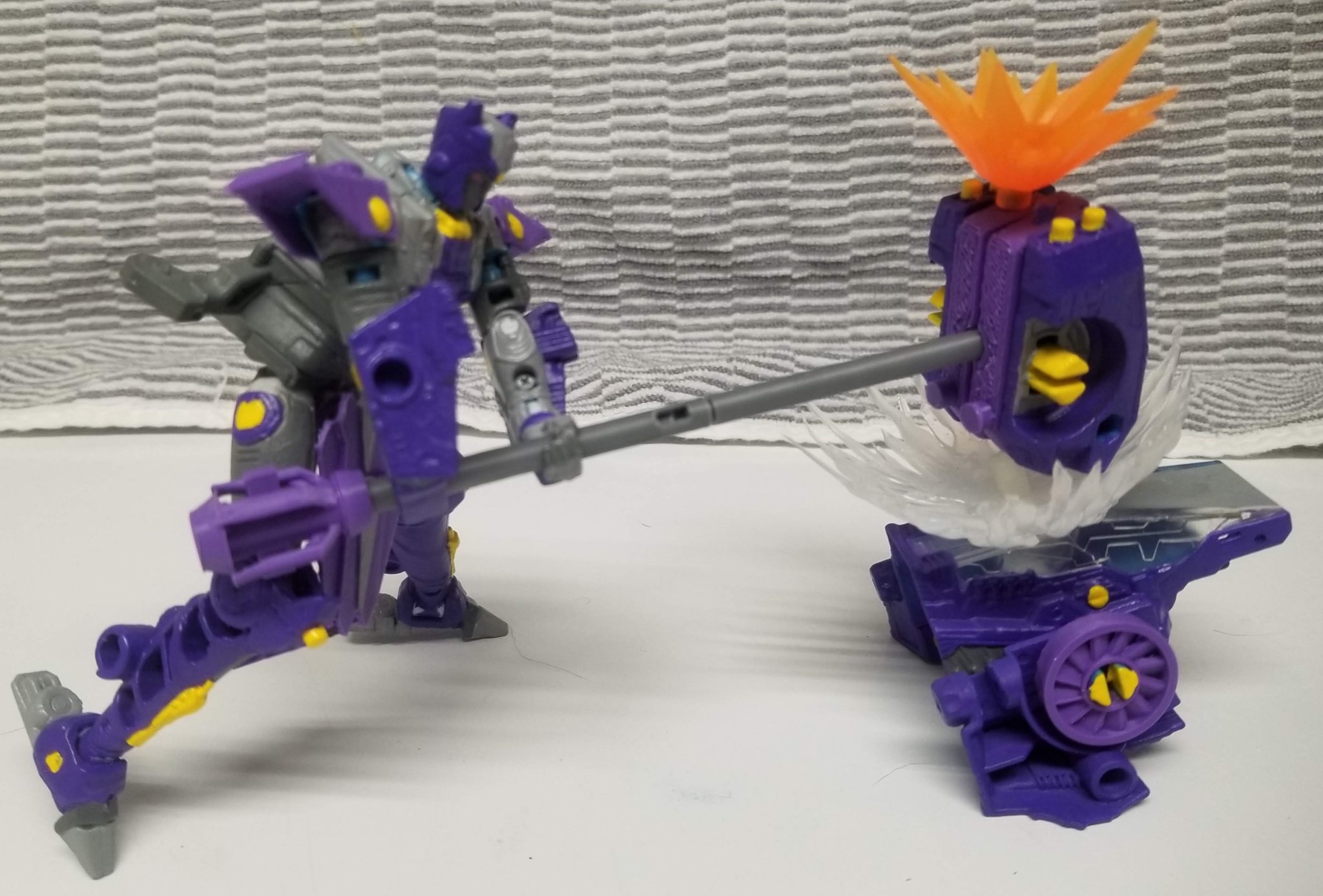 Here she is in bot mode. The hammer is a completely new design by me 3D printed to resemble that of the hammer from TR Solus. Its not an exact duplicate and there is a reason. Also designed by me are the added shoulder pads and the skirt crotch piece on the front also 3d printed.