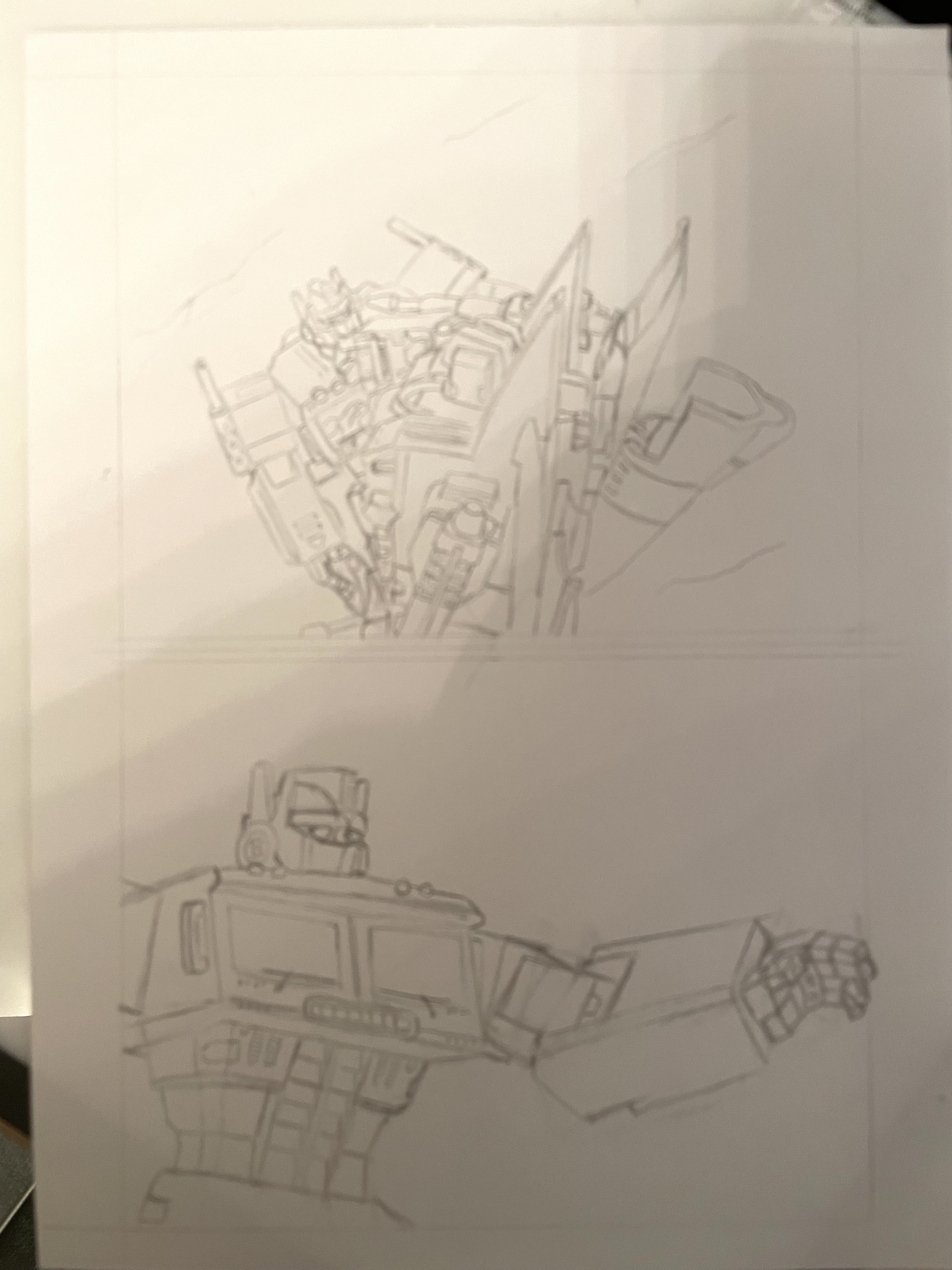 Here the first 5 pages drawn with a pencil, thanks to Earthrise Optimus Prime an Studio Series 86 Starscream I can put so much detail on them. when I finished the 6th page of 29th pages, I will then first ink the 6 first pages, coloring them and finally put the letters at least for the 6th first pages.