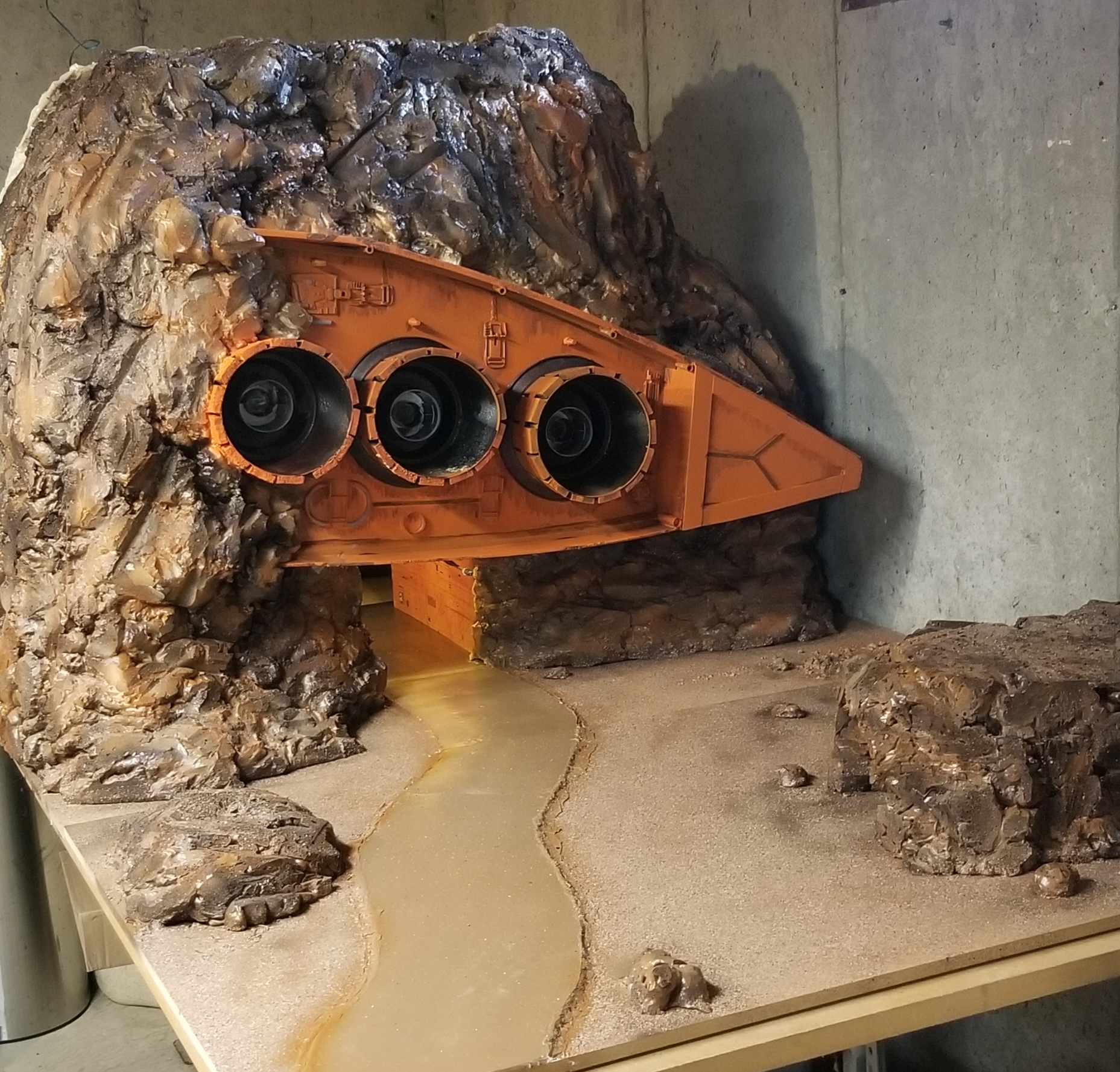 I spent the last couple days carving out the foam on the right side of the diorama. I made a small little cave out of the bigger rock in the back and added a couple of boulders here and there out of the cut off pieces.