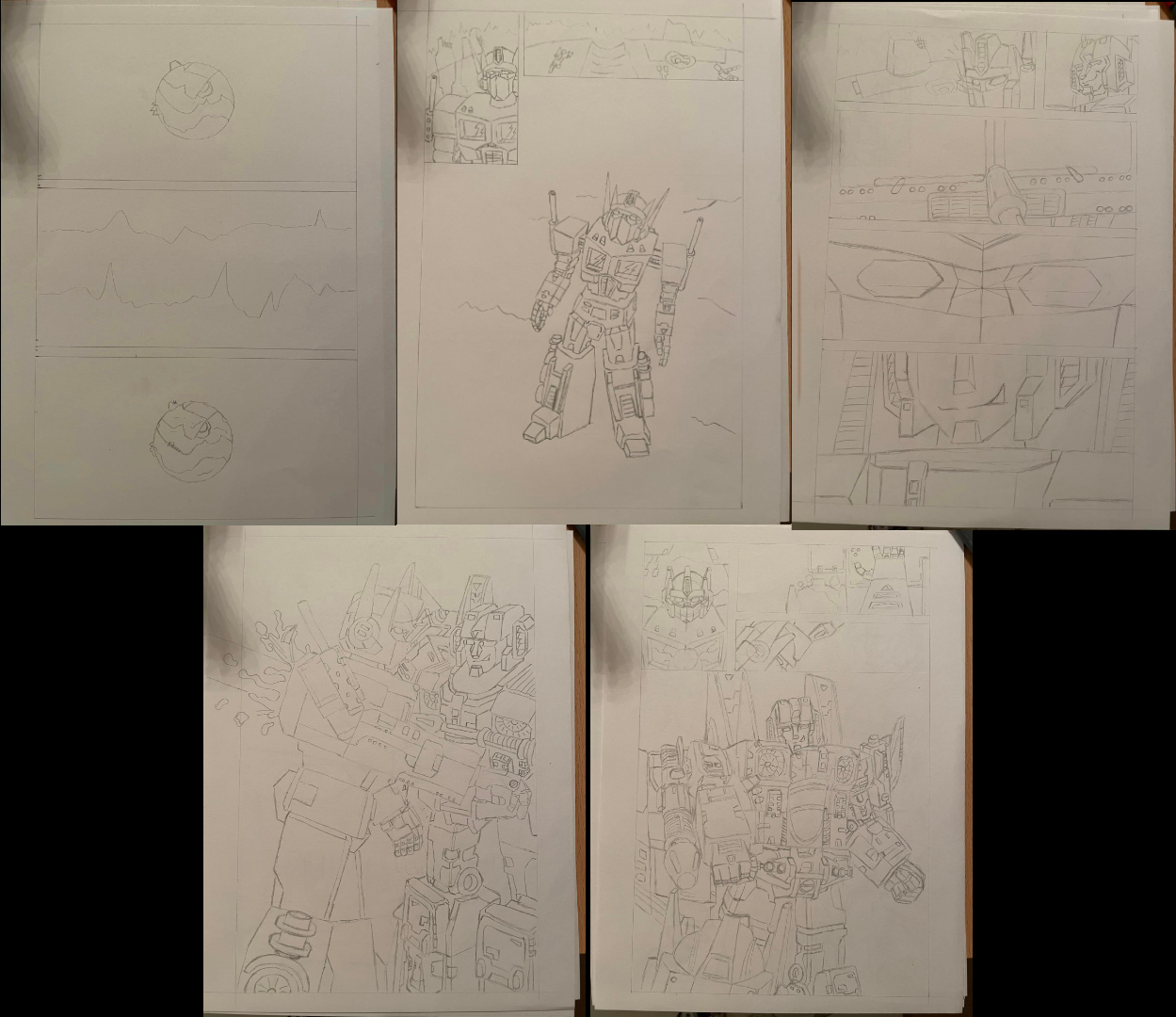 Here the first 5 pages drawn with a pencil, thanks to Earthrise Optimus Prime an Studio Series 86 Starscream I can put so much detail on them. when I finished the 6th page of 29th pages, I will then first ink the 6 first pages, coloring them and finally put the letters at least for the 6th first pages.