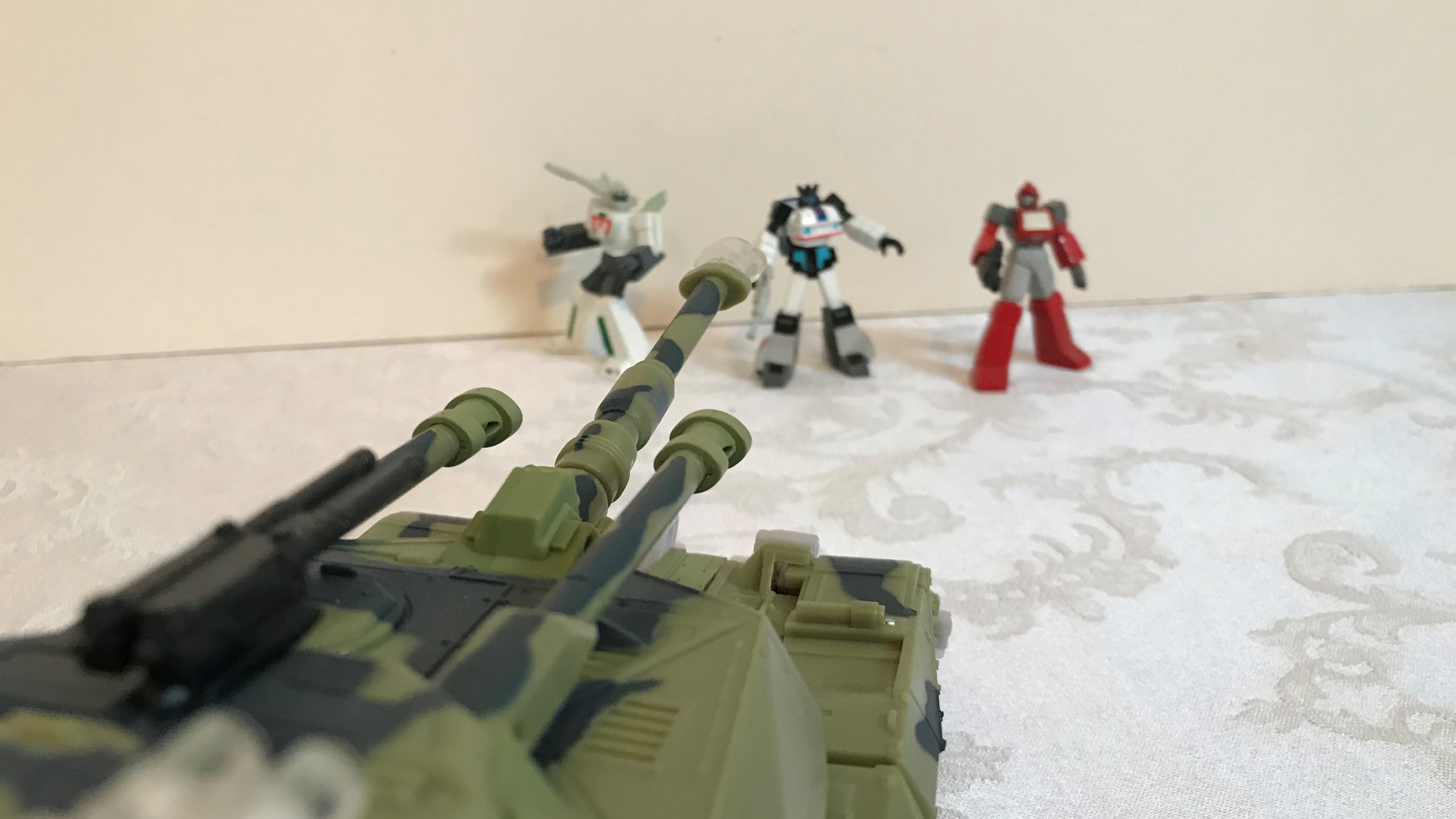 Well, I'll give it another try to keep things rolling on. Sorry for the 'bots being fuzzy. I was going for the scale and angle of the scene with this shot. Jazz, Ironhide, and Wheeljack are walking closer, intending to have a showdown with the crew inside the tank.