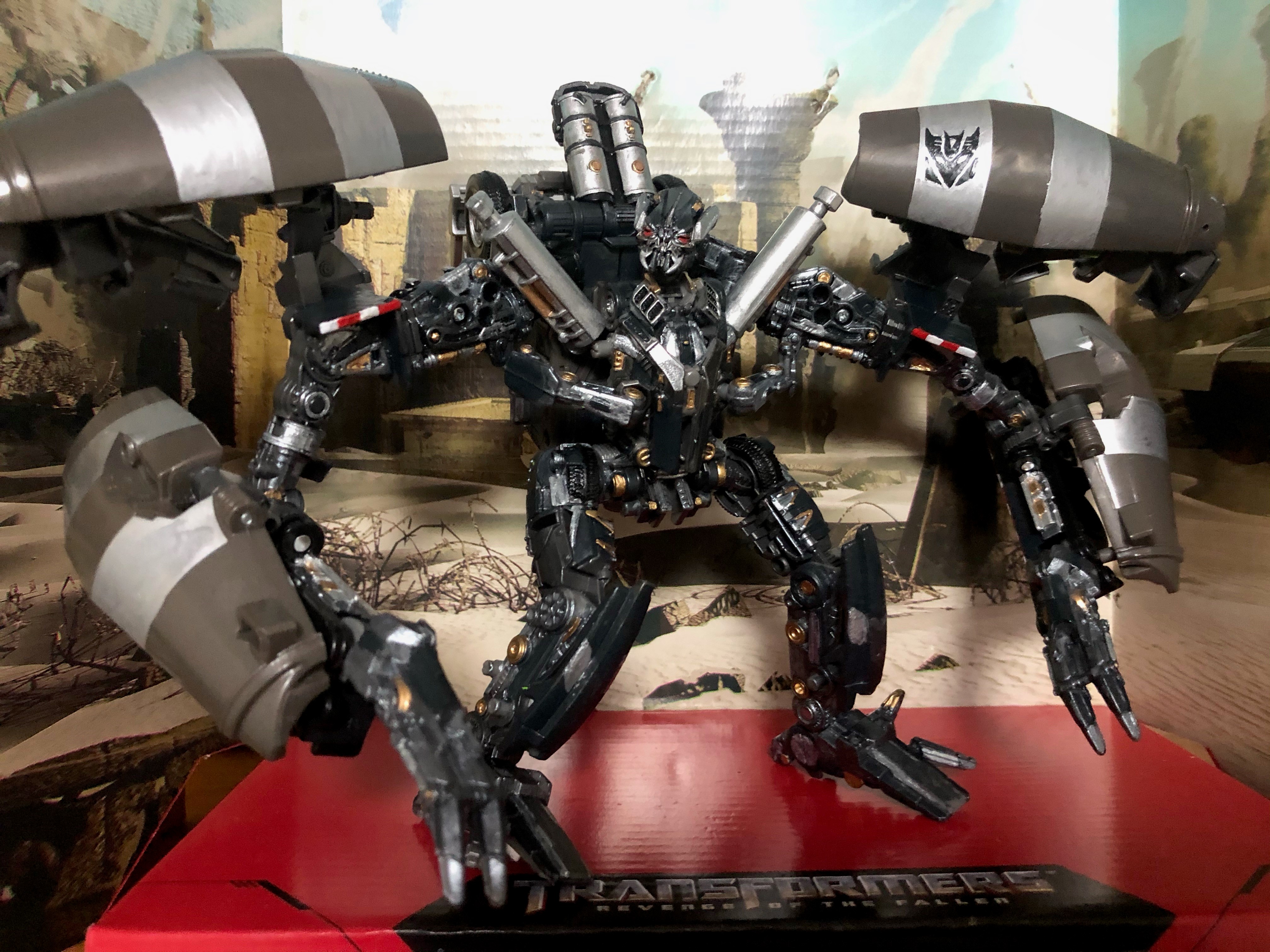 EDIT: Using some stickers from a 2009 ROTF sticker sheet as basis, I hand painted a Decepticon logo for the barrel!