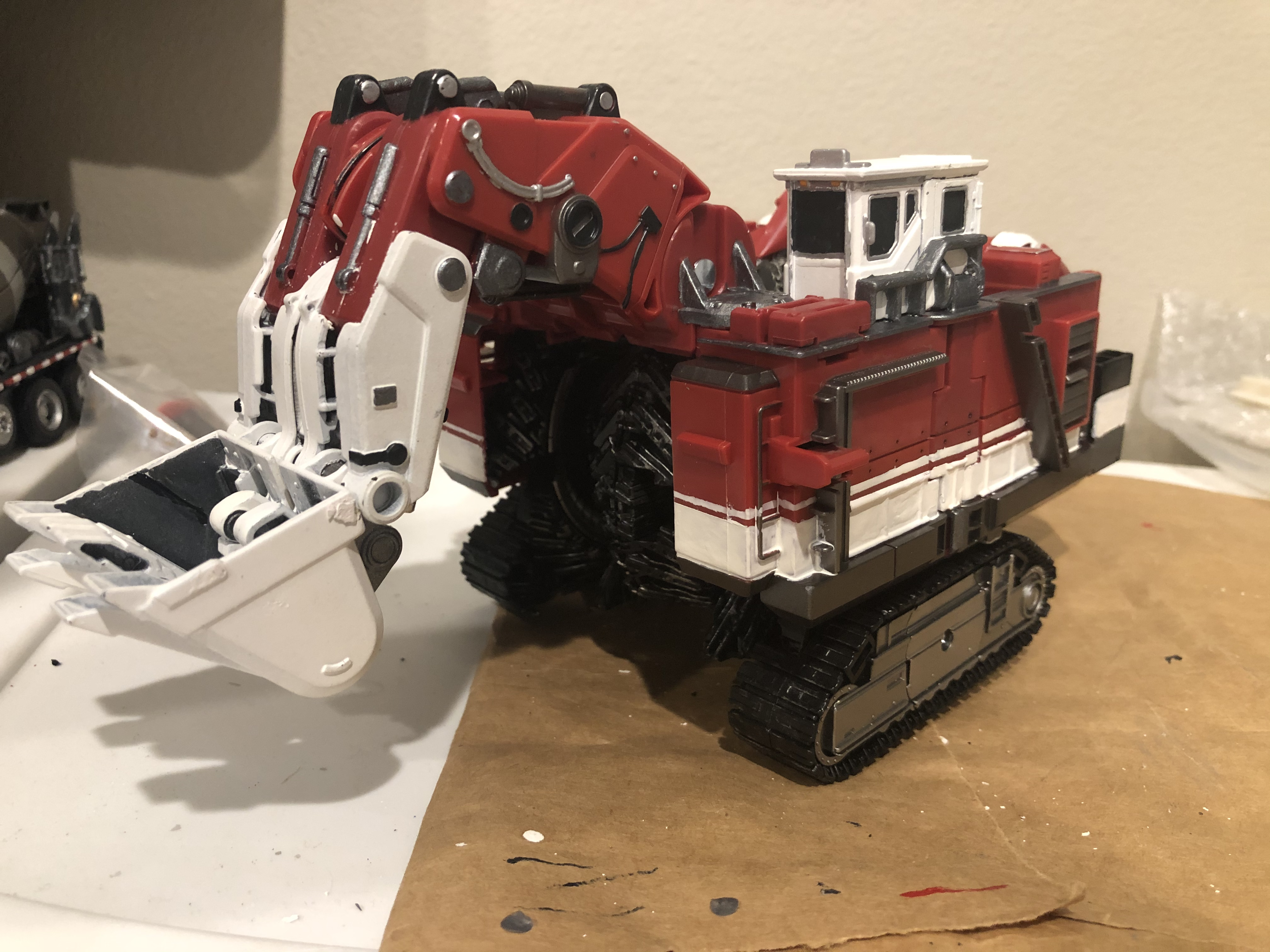 The key things I knew I wanted to do going into this were the white excavator scoop/forearms, the white with the pinstripe on the shoulder panels, and orange for the eyes. From there, I took some inspiration from Demolishor with the striping on the support struts for the wheels and a lot of the paint on the head. Various gunmetals and silvers were used, as always. The wheels (and the treads in alt. mode) were dry brushed silver, and the overall figure was sprayed with a flat coat (I figured that would work with the Excavator better than gloss. . . and I'm also currently out of gloss coat).