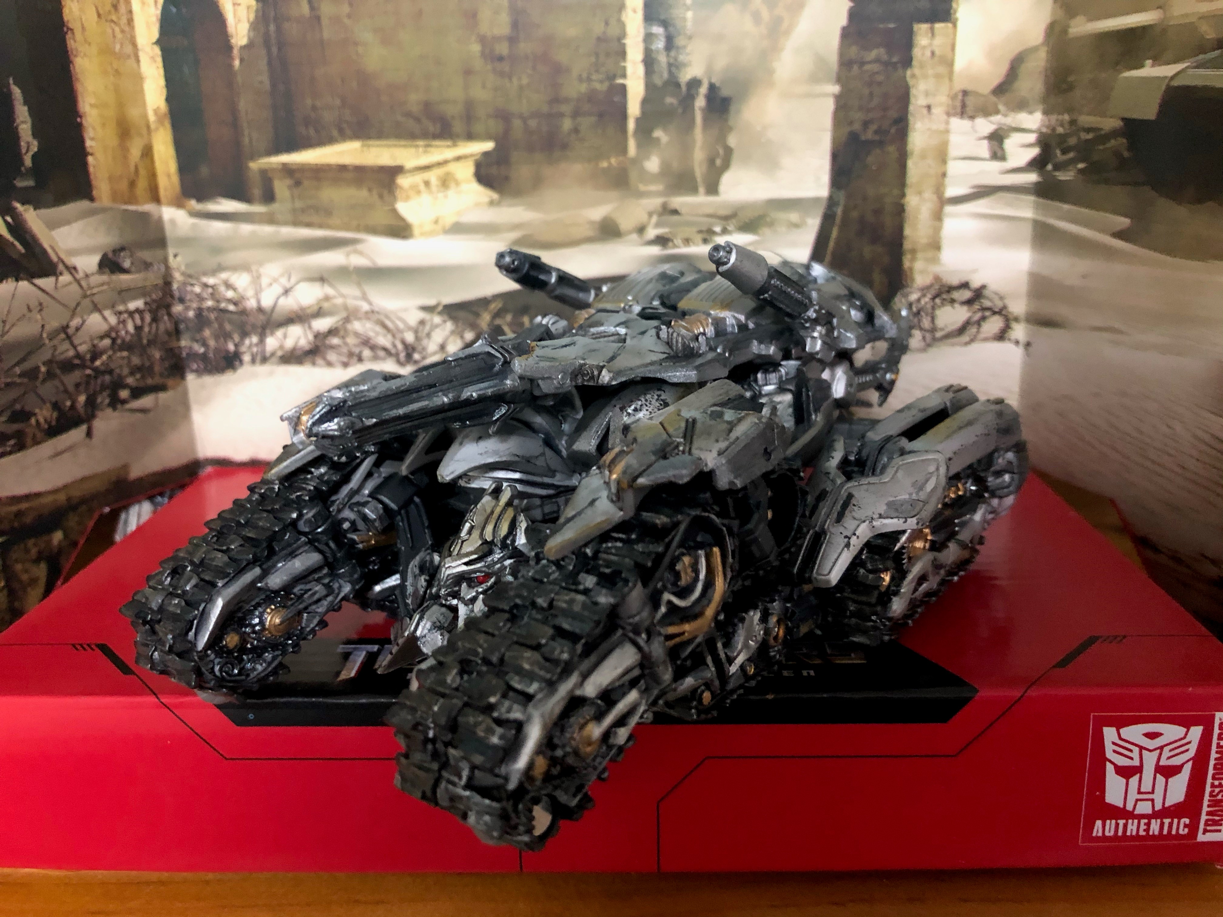 Vehicle mode was a lot like robot mode: silver base coat, gunmetal and gold detailing, and all of the previously described types of weathering. I used blue for the tank's thrusters (like the fusion cannon), and the desert sand weathering to fit in more with ROTF's setting.