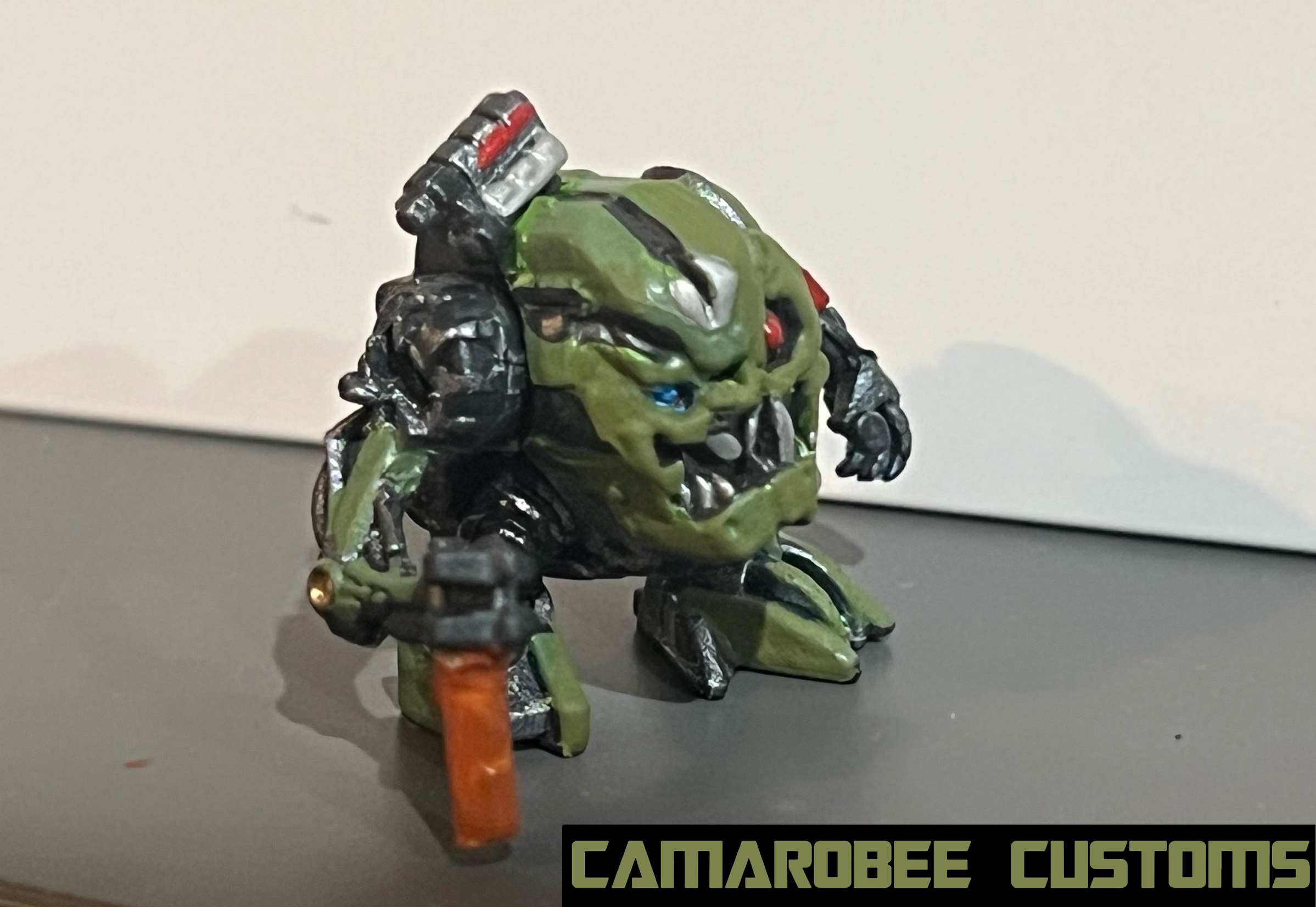 I made sure to paint Igor as well! To start I painted over all the gray plastic with gunmetal, then repainted the green with Testor's flat green, the same paint I'll be using on Long Haul. I painted one eye in blue and one in red like in DOTM, and used gold, red, and flat gunmetal for detailing.