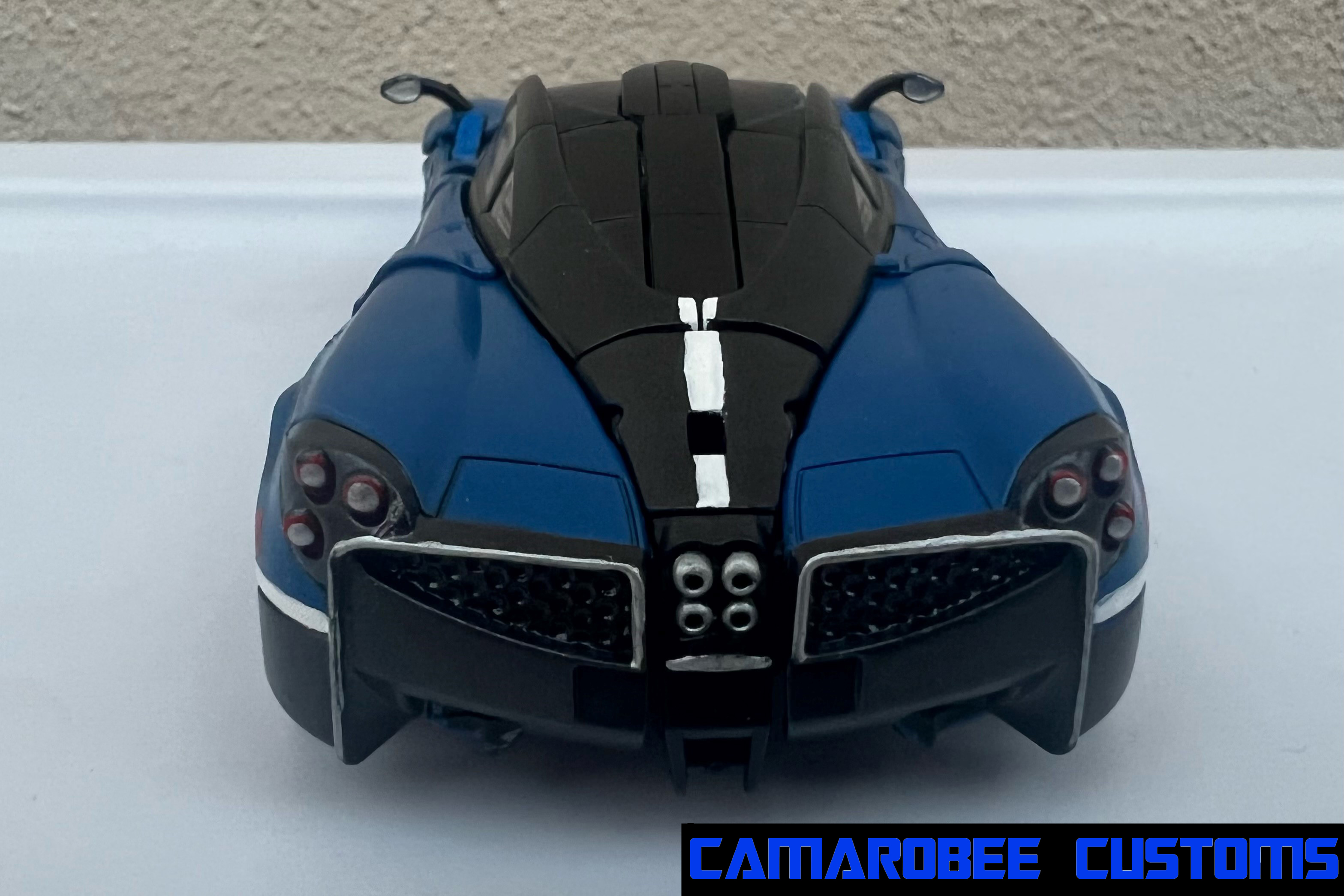 There's a little more to go over with alt mode because I did depart slightly from the prior Sentry in terms of deco. I based this on actual Pagani Huayras I found pictures of online, which includes the thin silver striping around the windows, and the gunmetal portions on the front and sides.