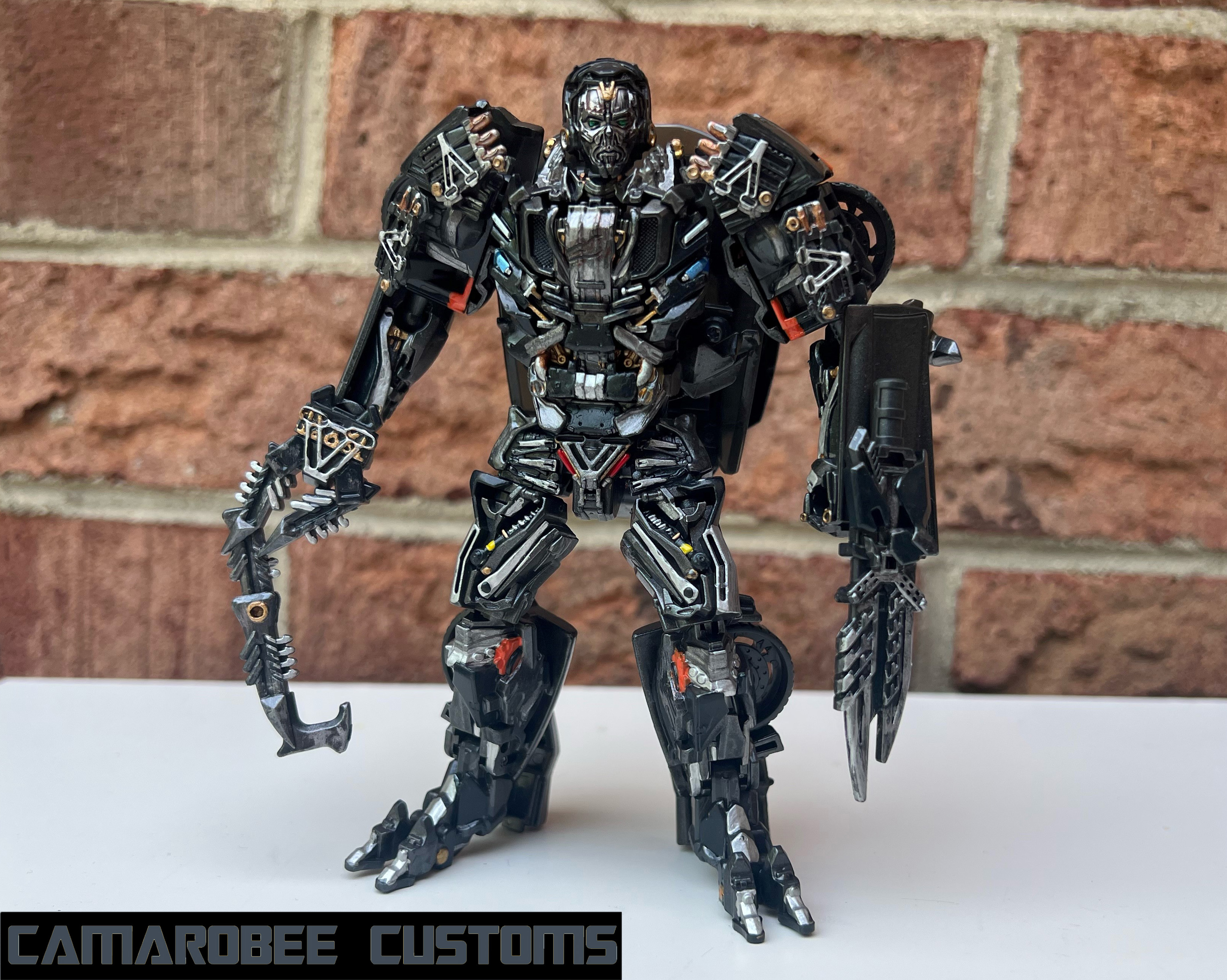 Lockdown was a super fun opportunity to work on my fine detail painting! After a Craftsmart gunmetal base, I used the Prime 1 Studios model and movie screenshots to add detailing primarily with silver and testor's darker flat gunmetal. The lights were painted with a mix of silver and metallic blue, and gold accents were added throughout bot mode. There was even some copper as well for the ammo clips/missiles on his arms! I painted the small Lamborghini logos on his chest with black and gold, and added small yellow and red details to the legs. One of my favorite details from Lockdown's CG model are the orange ABS brakes thast appear on his arms and legs, which I was able to add! I did have to technically mistransform the arms to have an area to add the brakes, but I actually prefer this orientation of the bicep area.