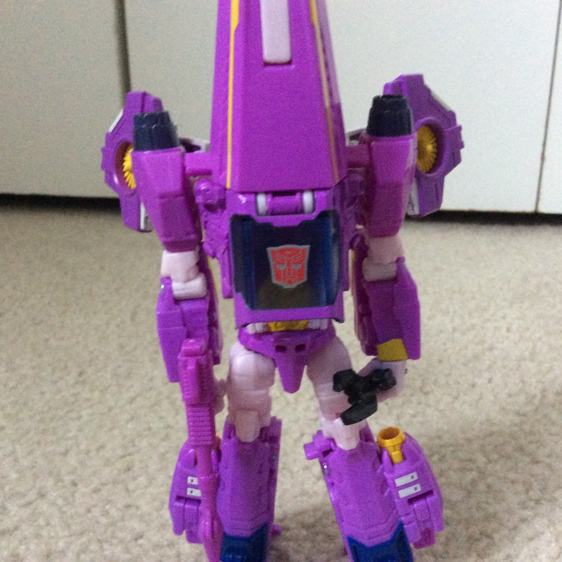Last thing I did was transfer the turbines from her arms to her back. To do so, I used some pieces from ROTF Sideways (specifically the lower legs). I then glued the turbines onto the black feet Sideways had