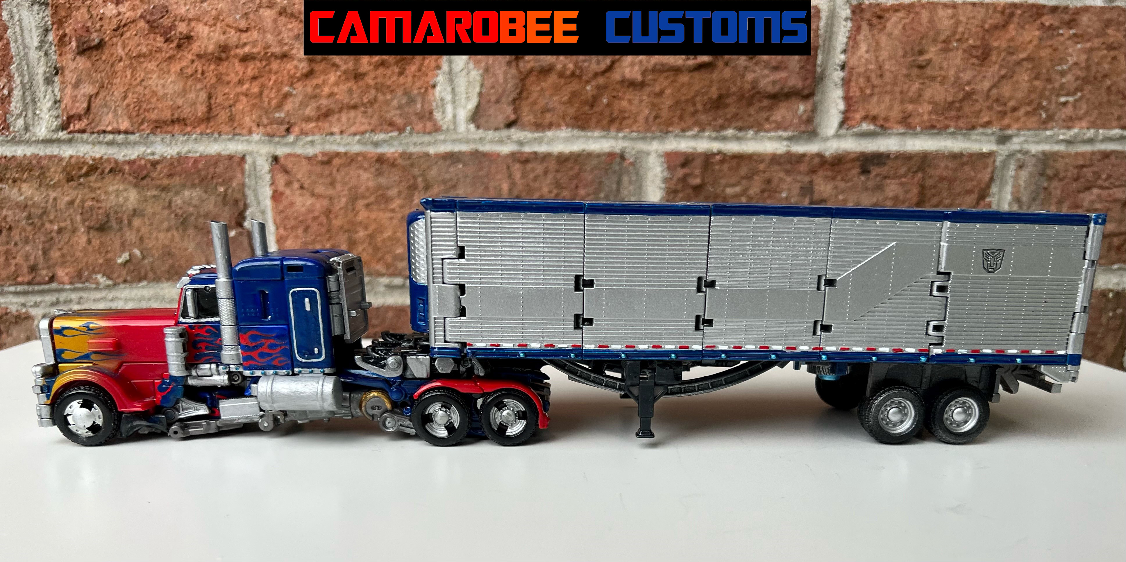 While I did publish an upload of this figure in the past, I wanted to be more ambitious with my paint work and make a truly definitive Optimus Prime. I've spent most of that time trying to perfect the flames, which were all hand painted (besides the ones the figure already had, which I traced over). I did make a stencil for the flames on the truck cab roof, but all the others were painted freehand.