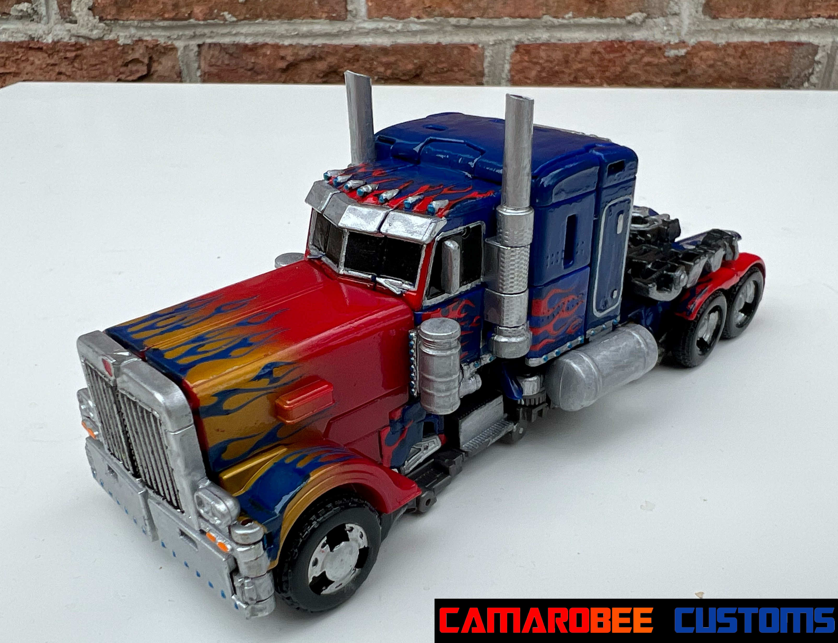 While I did publish an upload of this figure in the past, I wanted to be more ambitious with my paint work and make a truly definitive Optimus Prime. I've spent most of that time trying to perfect the flames, which were all hand painted (besides the ones the figure already had, which I traced over). I did make a stencil for the flames on the truck cab roof, but all the others were painted freehand.