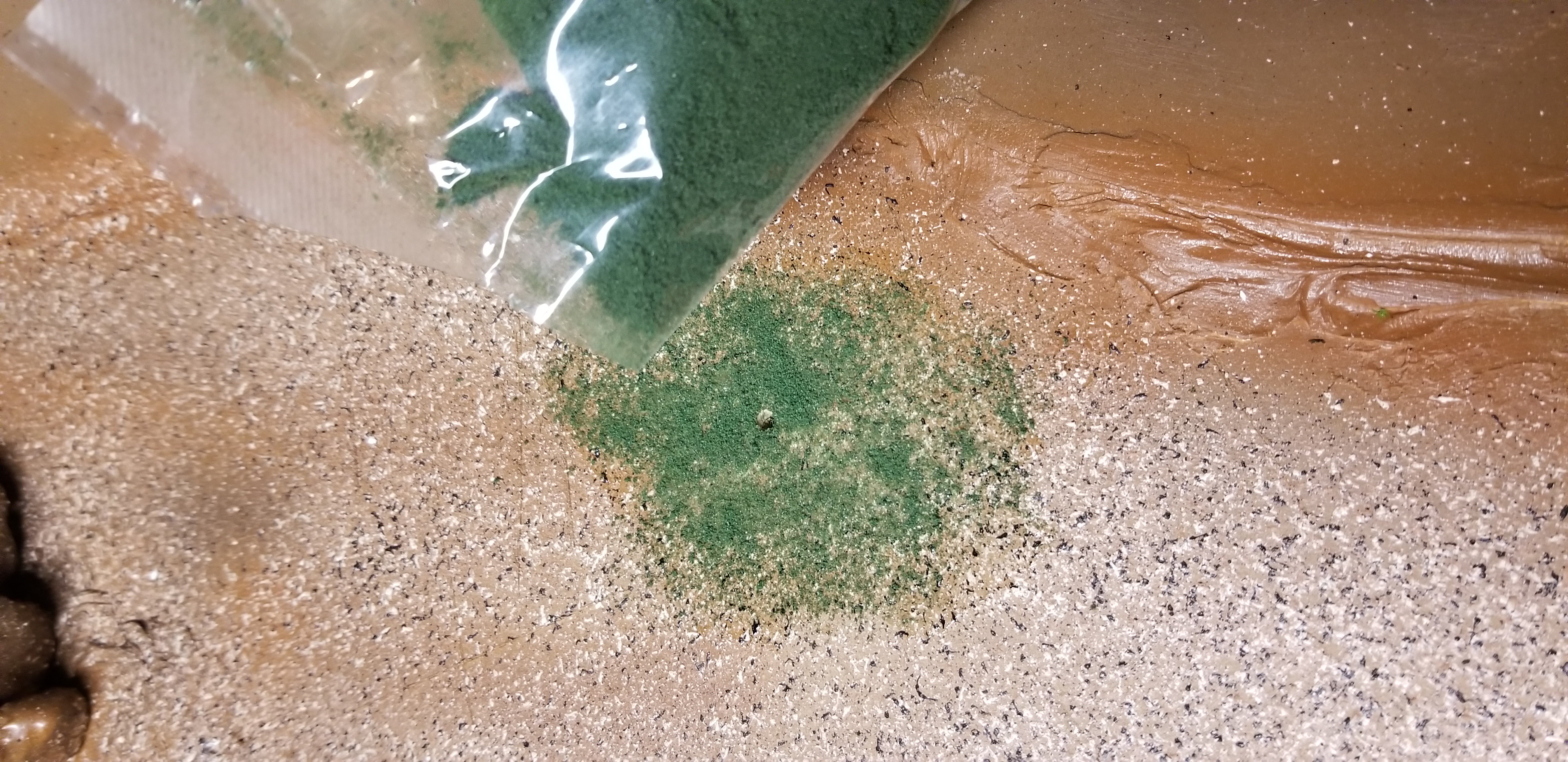 Once that dried, I wanted to give the ground on the base some texture. I found the perfect spray paint that would give it not only texture, but a variation in color and make it look like sand/dirt without the mess: